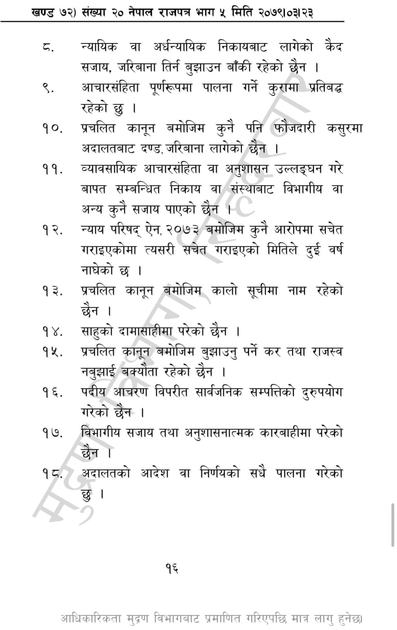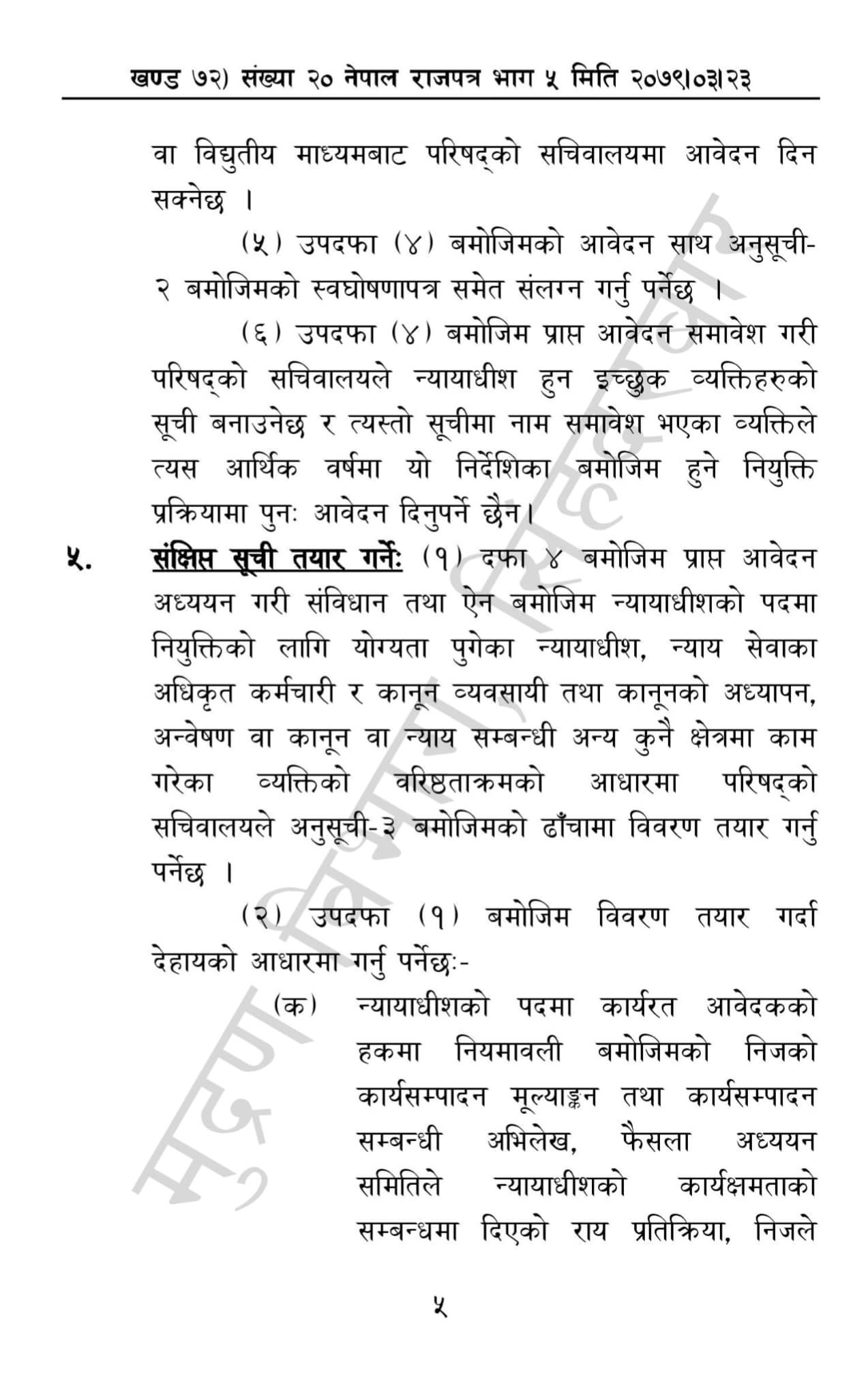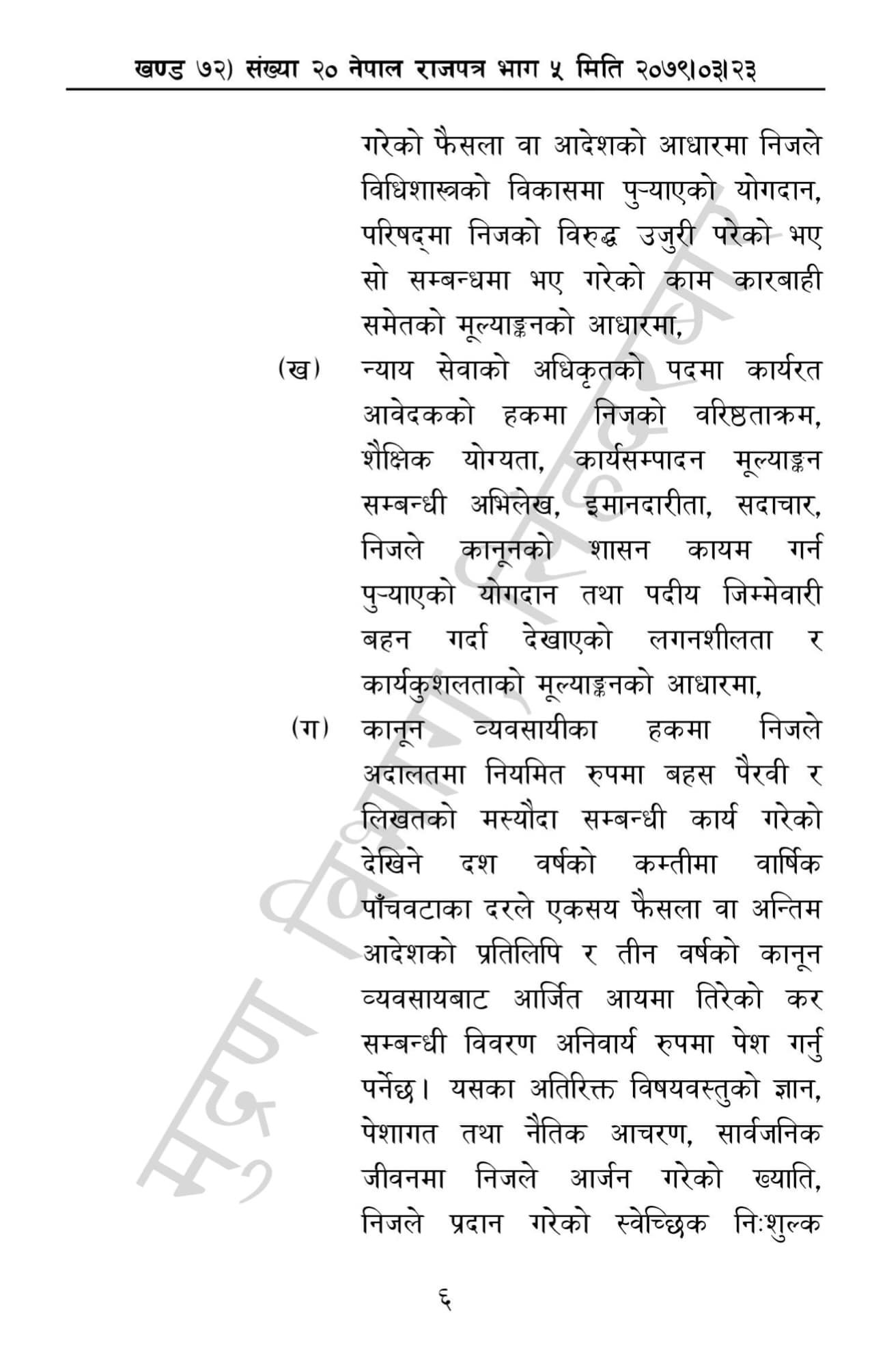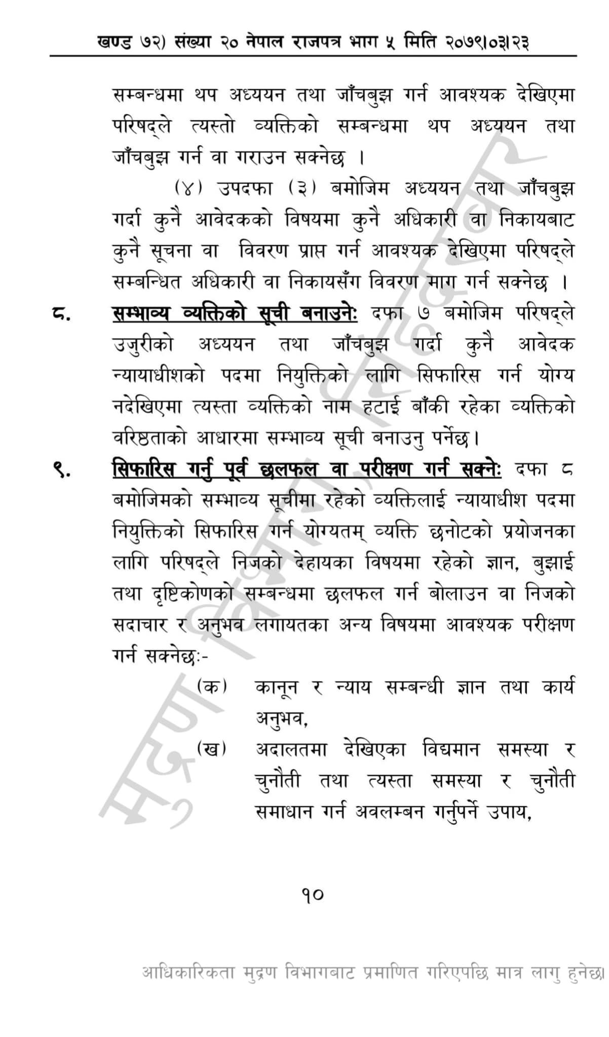 गत मंगलबार बसेको न्याय परिषद् बैठकले उच्च र जिल्ला अदालतका न्यायाधीश नियुक्तिका लागि मापदण्ड पारित गरेको थियो । सो मापदण्ड शुक्रबार राजपत्रमा प्रकाशित भएको छ ।