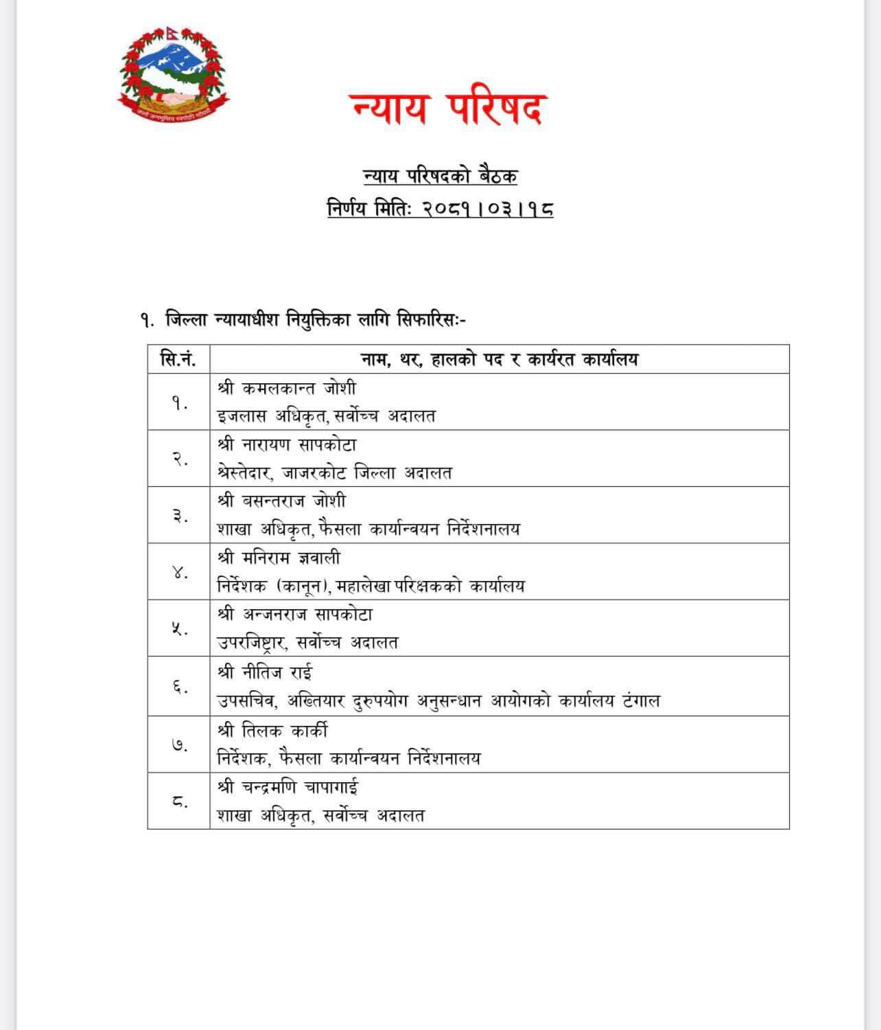 विभिन्न सेवामा कार्यरत कर्मचारीहरूबाट जिल्ला न्यायाधीश नियुक्तिको सिफारिस गरिएको छ ।