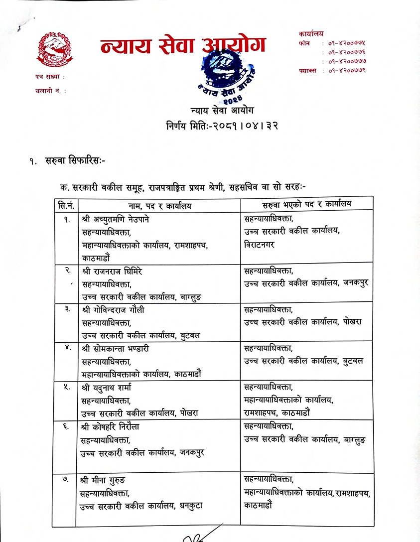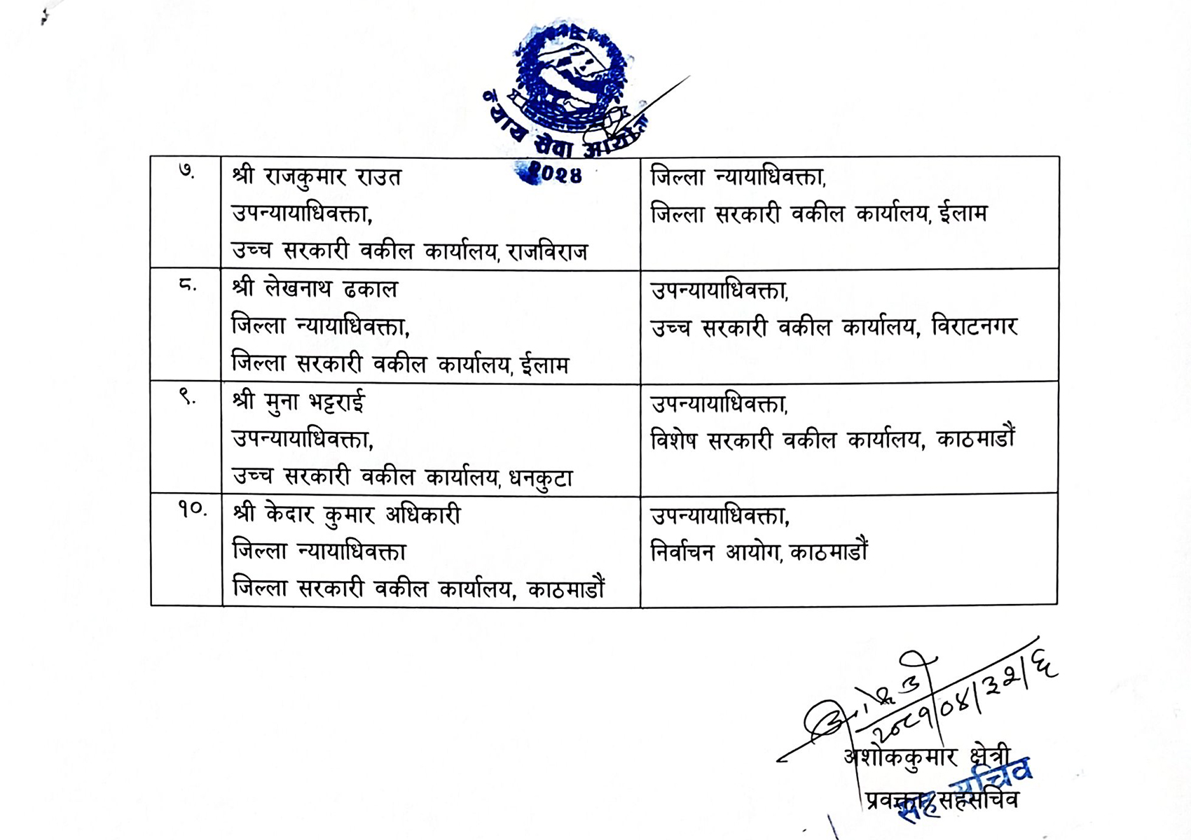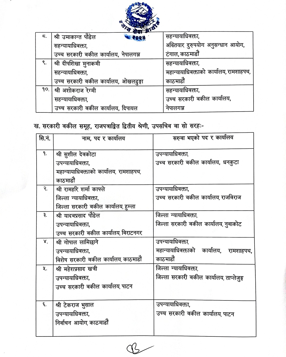 न्याय सेवा आयोगद्वारा सरकारी वकिल समूहका २० कर्मचारीको सरुवा सिफारिस