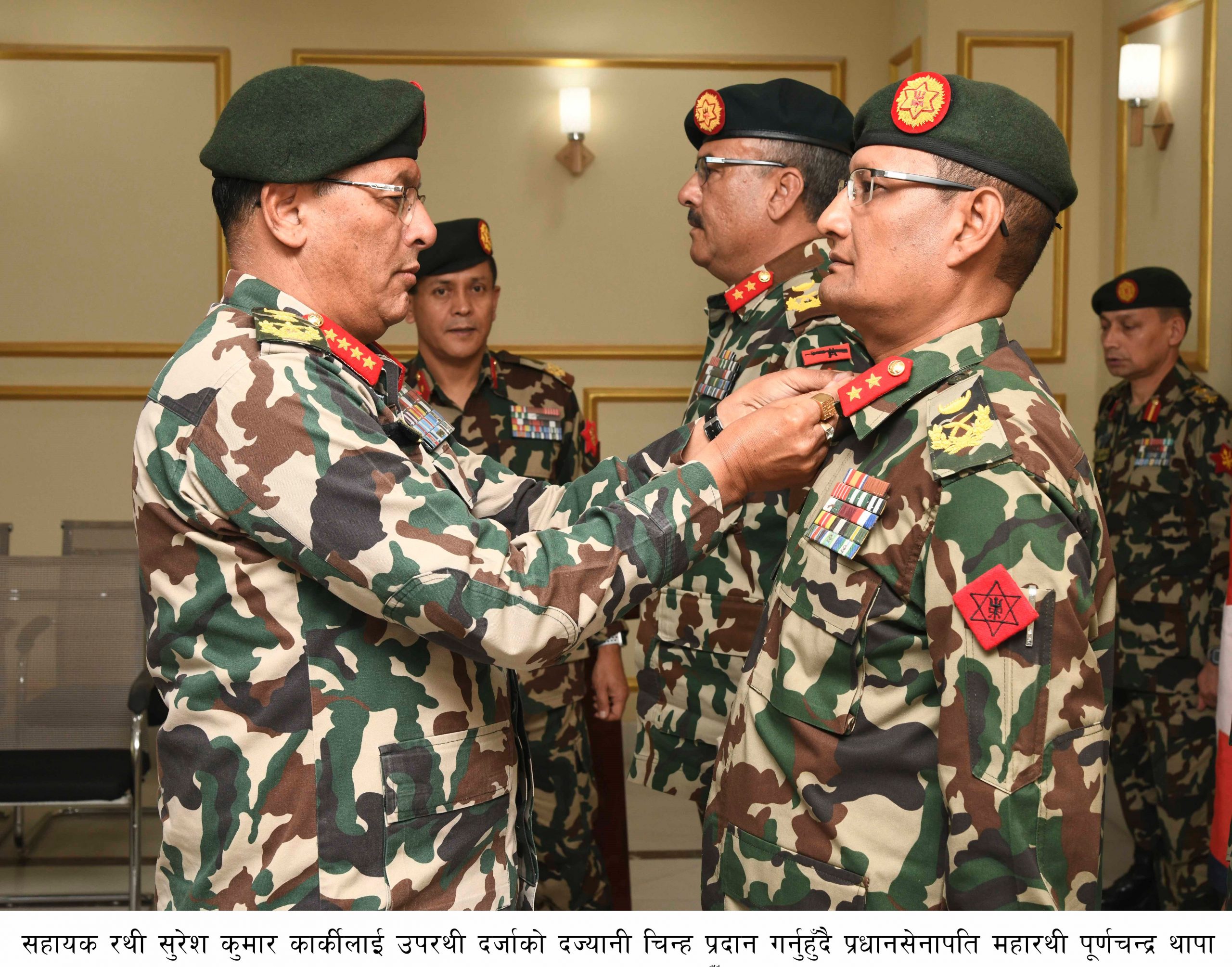 काठमाडौं – नेपाली सेनाको उपरथीमा बढुवा भएका सुरेश कुमार कार्कीलाई प्रधानसेनापति पूर्णचन्द्र थापाले दज्र्यानी चिन्ह प्रदान गरेका छन् । नेपाली सैनिक वार कलेज नगरकोटका प्रमुख रहेका सहायक रथी कार्कीलाई गत फाल्गुन १८ गते बसेको मन्त्रीपरिषद्को बैठकले उपरथीमा बढुवा गर्ने निर्णय गरेको थियो ।कार्कीलाई शुक्रवार जंगी अड्डामा आयोजित एक कार्यक्रमकाबीच प्रधानसेनापति थापाले उपरथी दर्जाको दज्र्यानी चिन्ह प्रदान गरेका हुन् ।