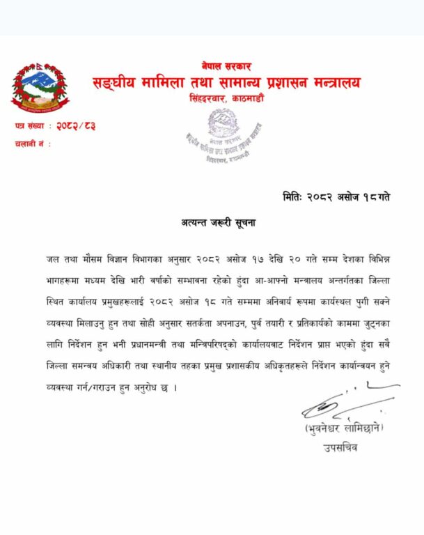 काठमाण्डु – जल तथा मौसम विज्ञान विभागले असोज १७–२० गतेसम्म देशका विभिन्न भागहरूमा मध्यमदेखि भारी वर्षा हुने पूर्वानुमान गरेपछि संघीय मामिला तथा सामान्य प्रशासन मन्त्रालयले जिल्लास्तरीय कार्यालय प्रमुखहरूलाई कार्यस्थलमा अनिवार्य रूपमा उपस्थित हुन निर्देशन दिएको छ ।
