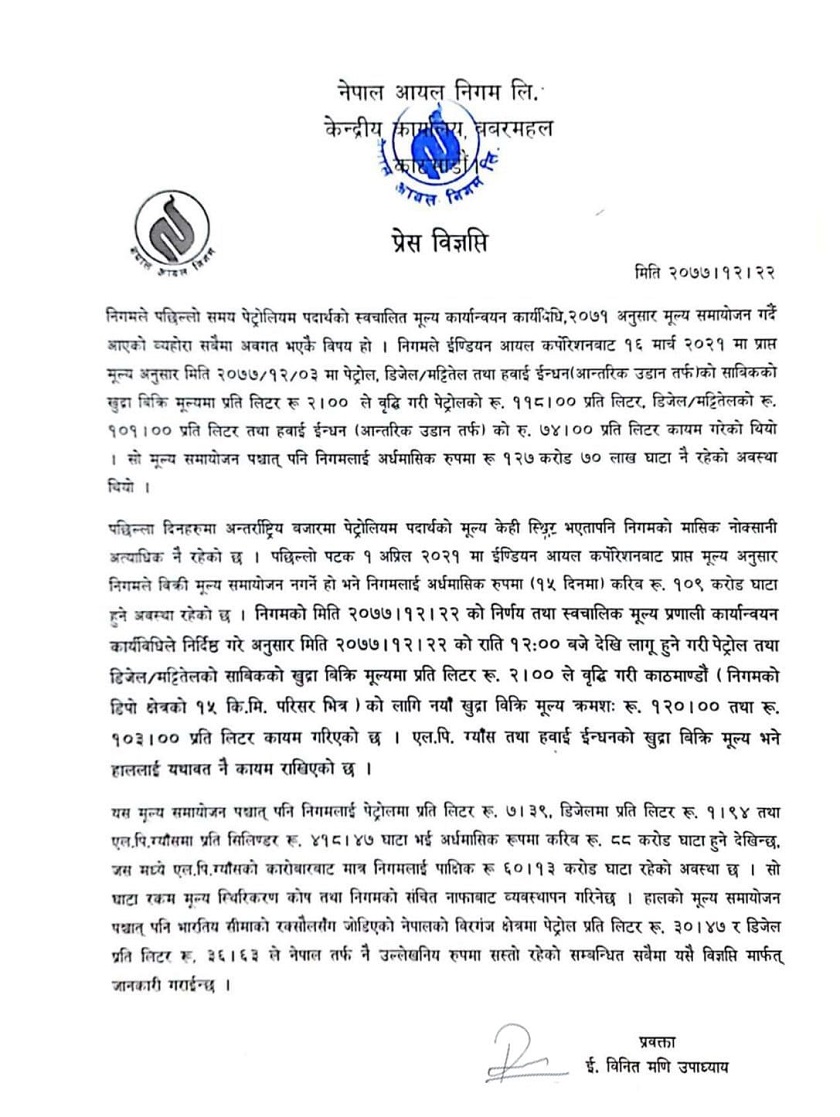 स्वचालित मूल्य प्रणाली कार्यान्वयन कार्यविधिले निर्दिष्ट गरेअनुसार आइतबार राति १२ बजेबाट लागू हुने गरी मूल्य बढेको हो । खाना पकाउने ग्याँस तथा हवाई इन्धनको बिक्री मूल्य भने हाललाई यथावत् नै राखिएको निगमले जनाएको छ ।