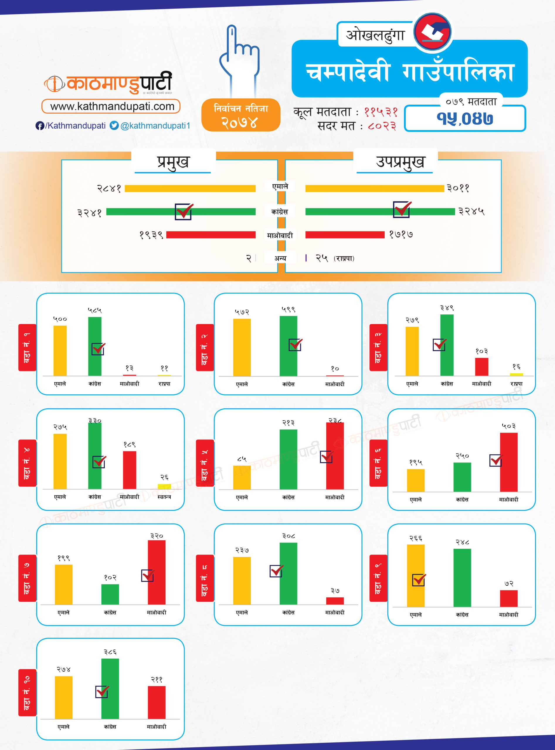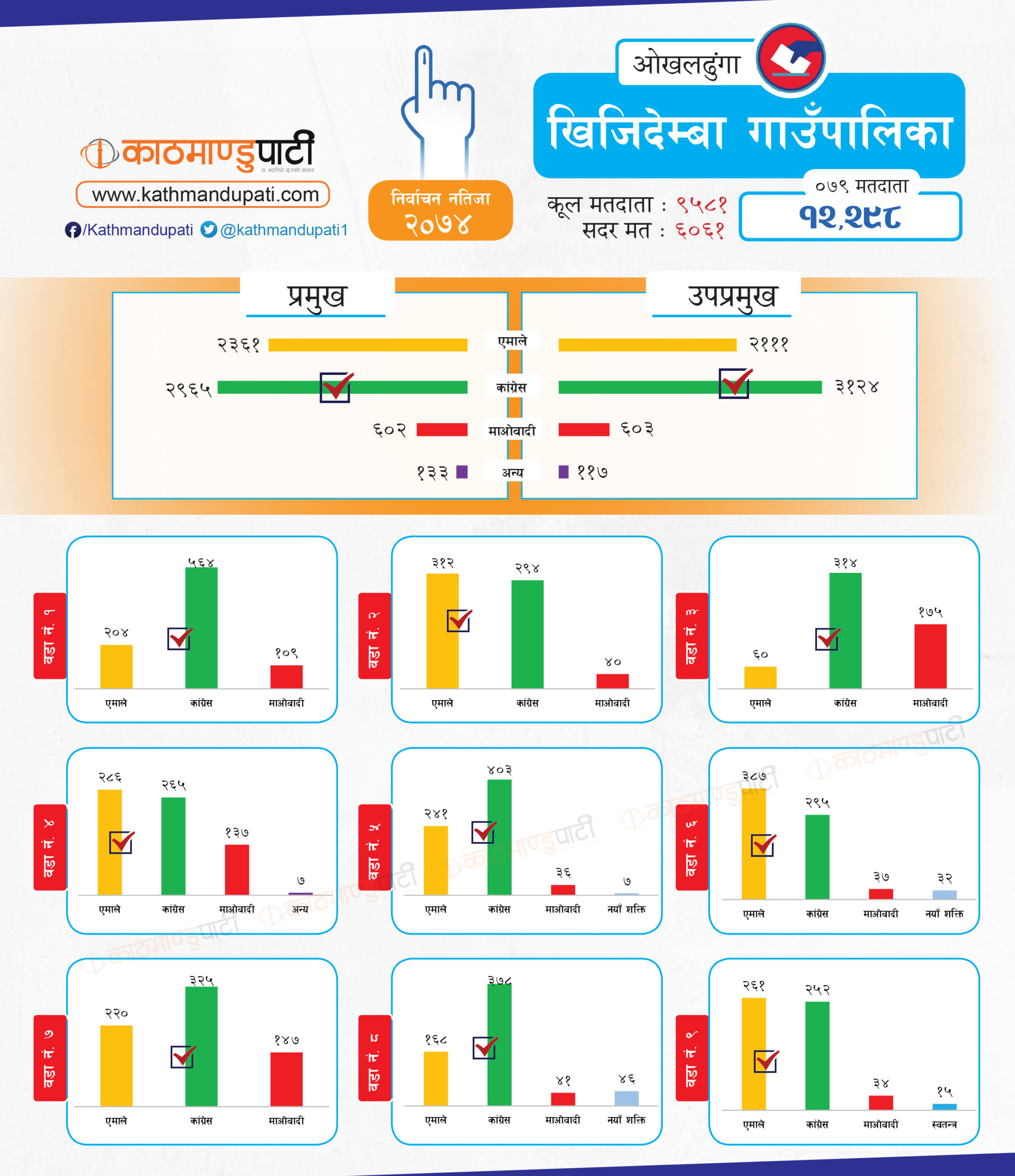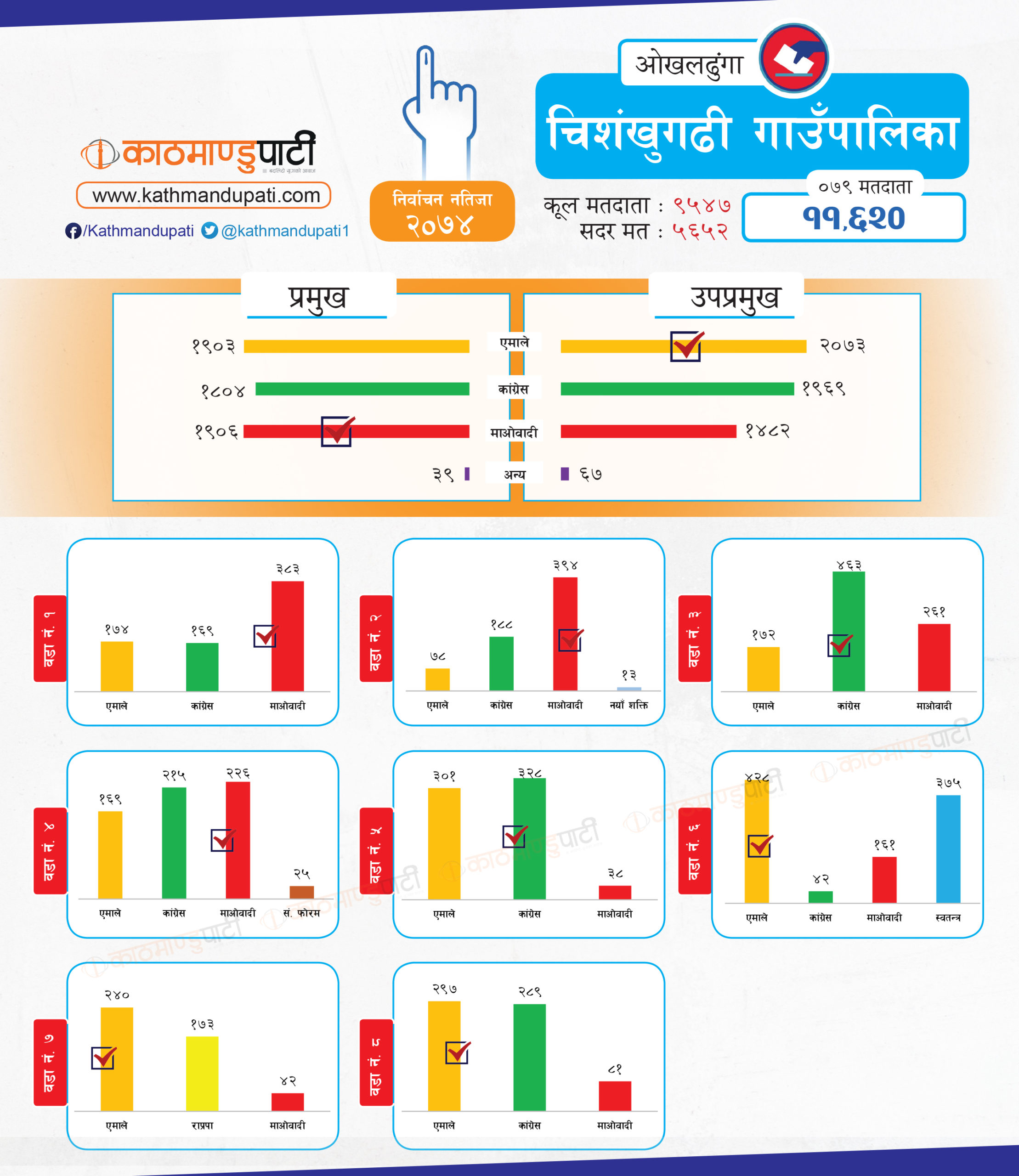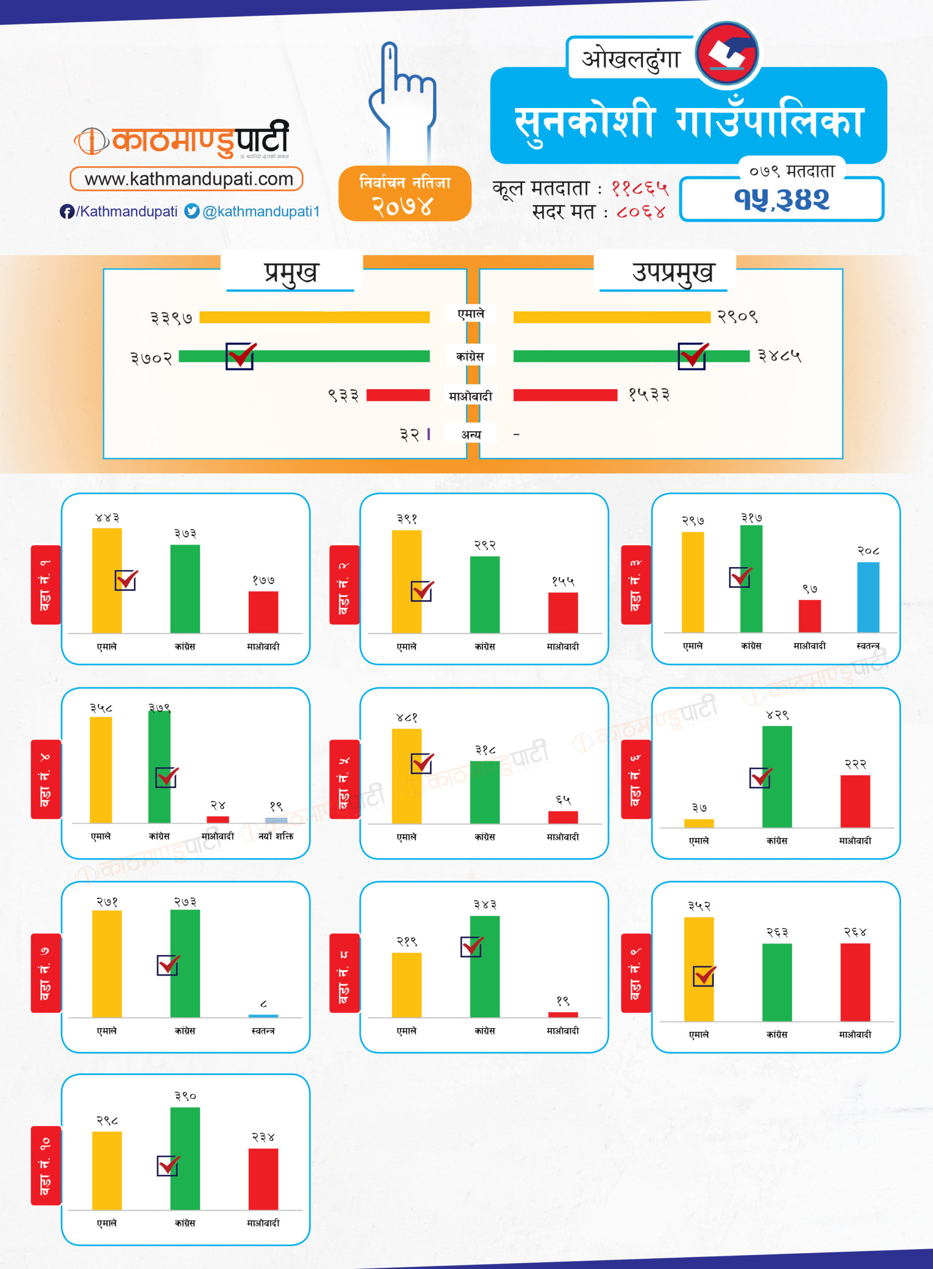 उसले जितेका सबै पालिकामा ठूलो मतान्तर छ । एमाले र माओवादीले जितेका तहमा त्यस्तो देखिन्न । यदि गठबन्धन बन्यो भने जिल्लामा त्यसले नै अधिकांश पालिका जित्ने देखिन्छ । बनेन भने कांग्रेस पहिलो र एमाले दोस्रो स्थानमा आउनेछन् । तर, कसले कतिवटा पालिका जित्छन् भनेर अहिले नै यकिन गर्न भने गाह्रो छ । जिल्लामा १ लाख १७ हजार ८५ मतदाता छन् । तीमध्ये ५९ हजार १ सय ६२ पुरुष र ५७ हजार ९ सय ९२ महिला छन् ।