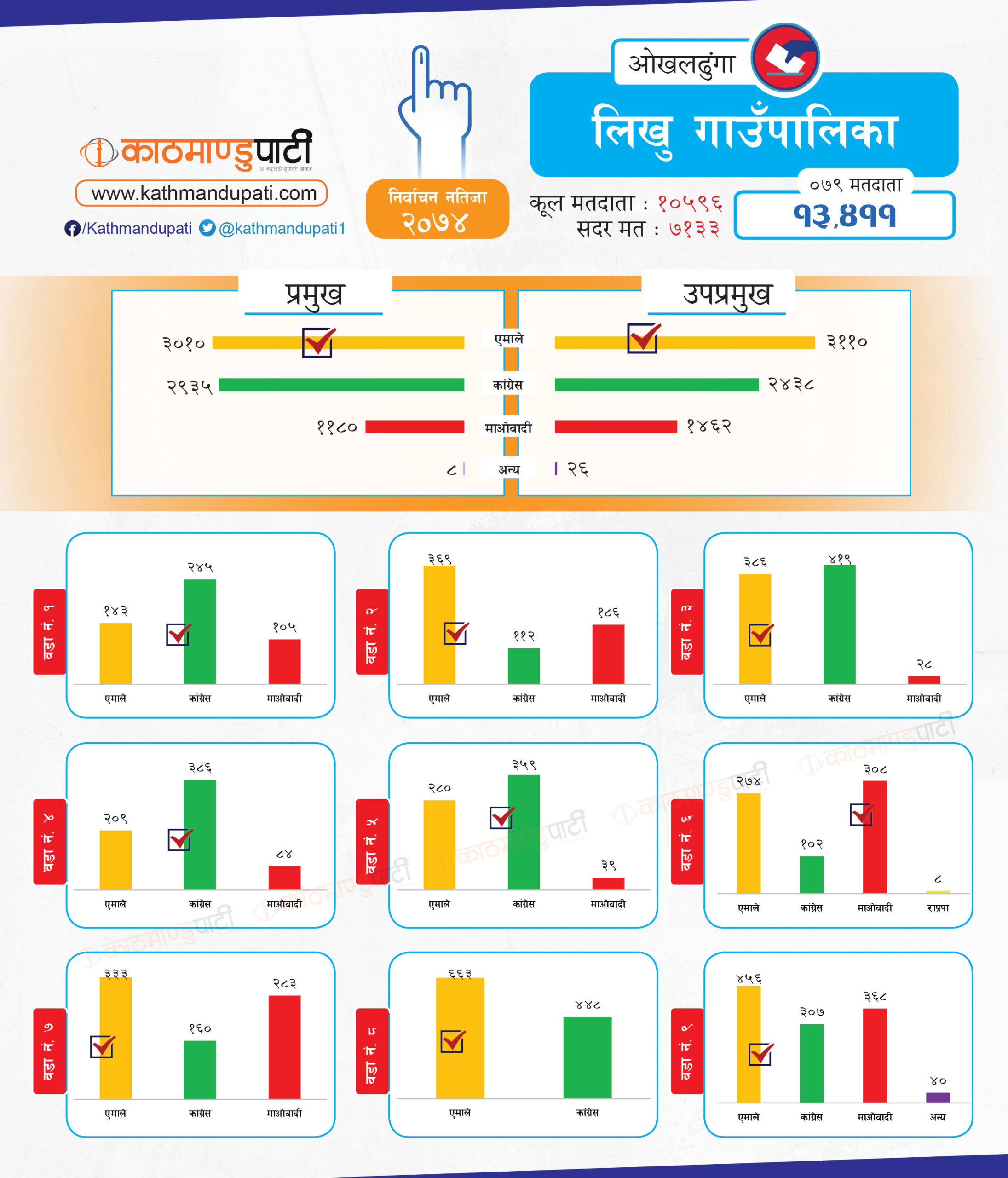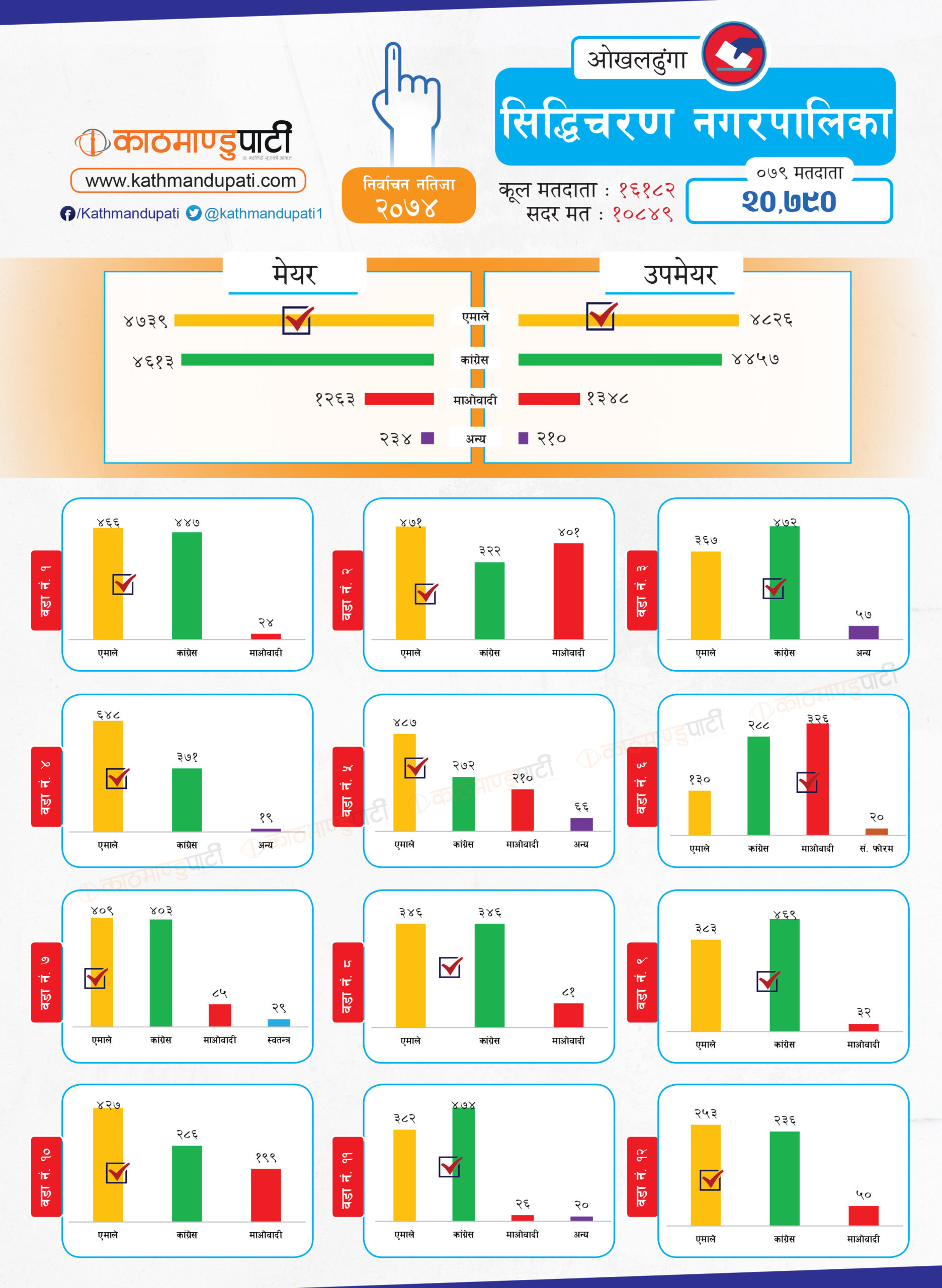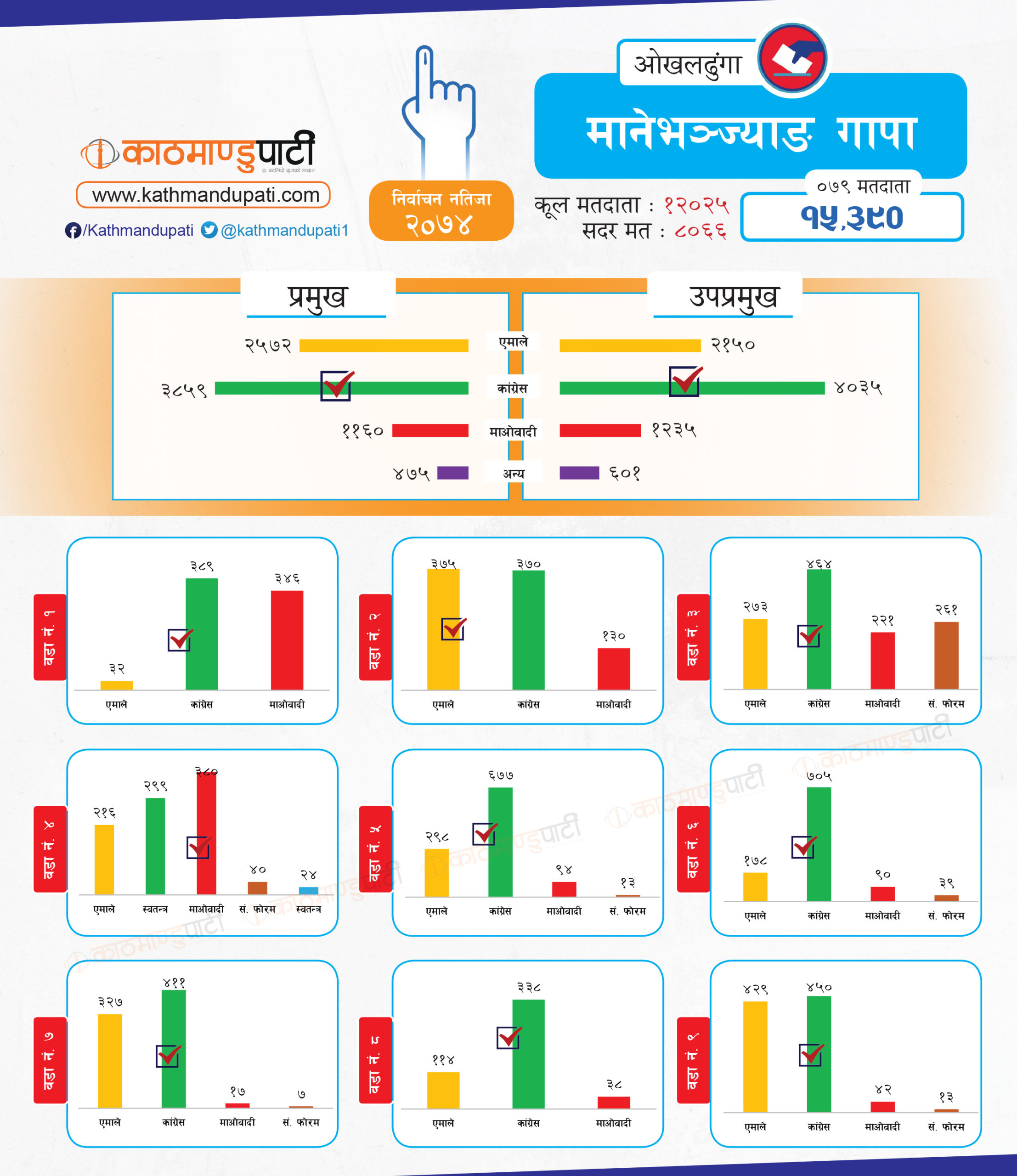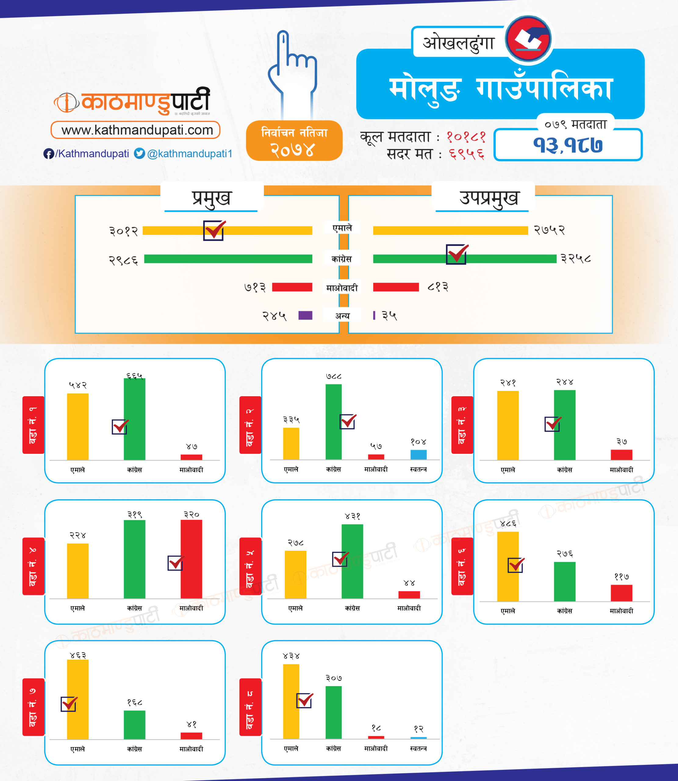 सिद्धिचरण नगरपालिकाको मेयर र उपमेयरमा एमालेले झिनो मतान्तरले जित निकाल्यो । त्यसबाहेक उसले लिखु गाउँपालिकामा अध्यक्ष–उपाध्यक्ष तथा मोलुङ गाउँपालिकामा अध्यक्ष र चिशंखुगढीमा उपाध्यक्ष पद पनि जित्यो । माओवादीले चिशंखुगढीमा अध्यक्ष जित्यो । त्यो पनि ३ मतको अन्तरले मात्रै । जिल्लामा कतै फराकिलो मतान्तर त कतै झिनो अन्तर देखियो । कांग्रेसले जितेका स्थानीय तहमा मतान्तर ठूलो देखिन्छ । तर, एमालेले भने निकै प्रतिस्पर्धामा बाजी मारेको छ । मोलुङमा उसले जम्मा २६ मतले अध्यक्ष जितेको थियो ।