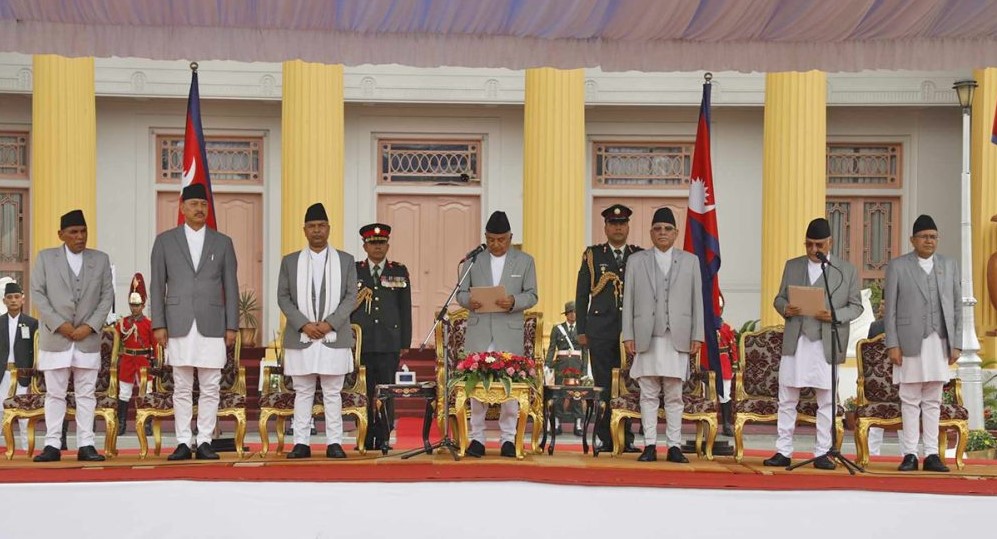काठमाण्डु – प्रधानमन्त्री केपी शर्मा ओली २ उपप्रधानमन्त्री र १९ मन्त्रीले पद तथा गोपनियताको शपथ लिएका छन् । राष्ट्रपति रामचन्द्र पौडेलले उनीहरूलाई पद तथा गोपनियताको शपथ खुवाएका छन् ।