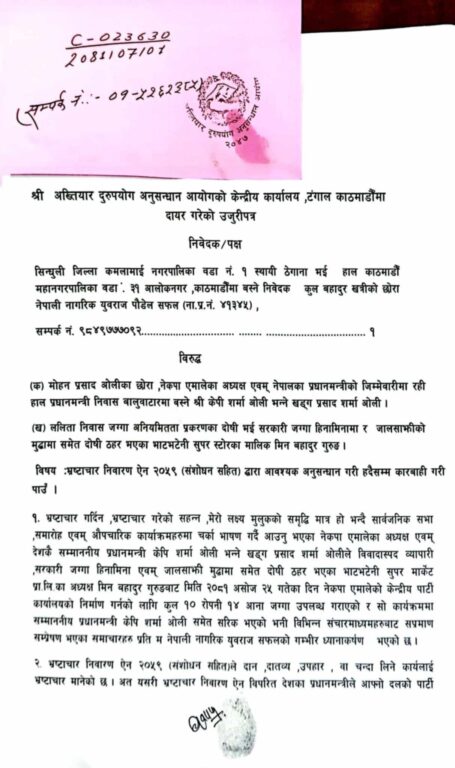 काठमाण्डु-प्रधानमन्त्री केपी शर्मा ओली र व्यवसायी मिनबहादुर गुरुङविरुद्ध अख्तियार दुरुपयोग अनुसन्धान आयोगमा उजुरी परेको छ ।