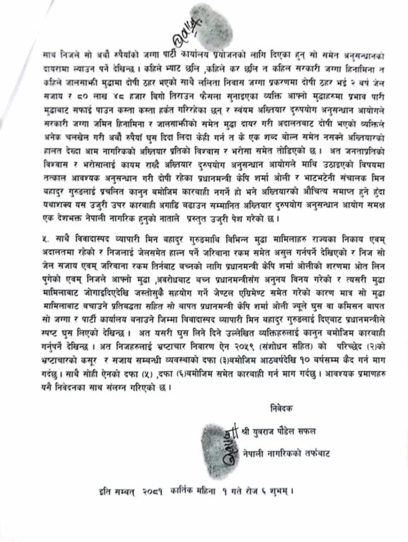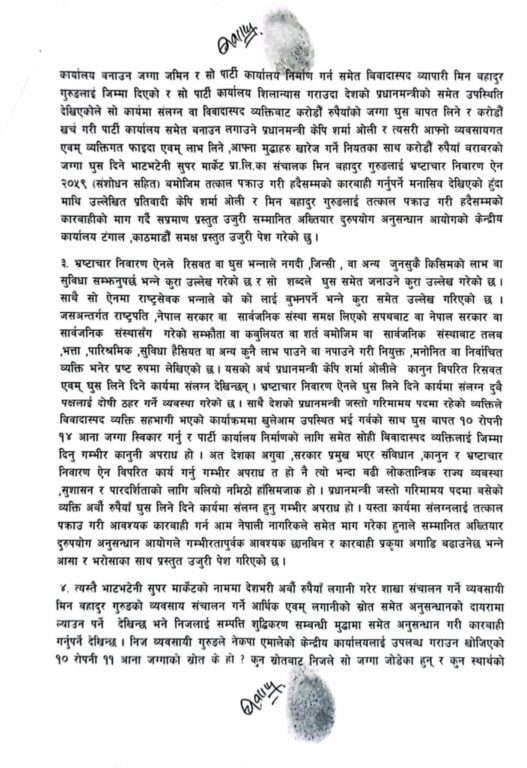 ‘विवादास्पद व्यक्तिबाट करोडौं रुपैयाँको जग्गा घुस वापत लिने र करोडौं खर्च गरी पार्टी कार्यालयसमेत बनाउन लगाउने प्रधानमन्त्री केपी शर्मा ओली र आफ्नो व्यक्तिगत एवं व्यवासायगत लाभ लिने, आफ्ना मुद्दा खारेज गर्ने नियतका साथ करोडौंको जग्गा घुस दिने भाटभटेनी सुपरमार्केटका सञ्चालक मीनबहादुर गुरुङ भ्रष्टाचार निवारण ऐन २०५९ (संशोधन सहित) बमोजिम तत्काल पक्राउ गरी हदैसम्मको कारबाही गर्नुपर्ने मानसिव देखिएको‘,’ उजुरीमा भनिएको छ ।