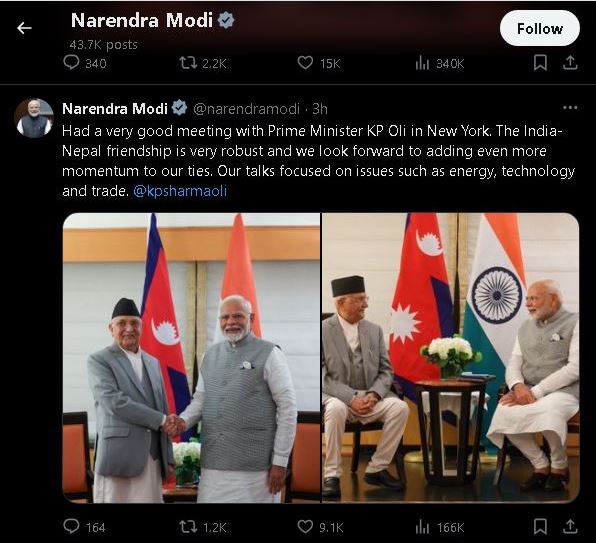 ‘प्रधानमन्त्री केपी ओलीसँग न्यूयोर्कमा निकै राम्रो भेट भयो । भारत–नेपाल मित्रता धेरै बलियो छ । हामी हाम्रो सम्बन्धलाई अझ गति दिन चाहन्छौँ । हाम्रो वार्ता ऊर्जा, प्रविधि र व्यापार जस्ता मुद्दाहरूमा केन्द्रित थियो’, मोदीले एक्समा भनेका छन् ।