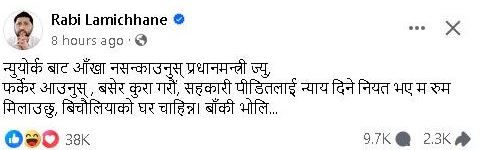 प्रधानमन्त्री ओलीलाई सम्बोधन गर्दै उनले लेखेका छन्, ‘न्युयोर्कबाट आँखा नसन्काउनुस् प्रधानमन्त्रीज्यू । फर्केर आउनूस । बसेर कुरा गरौँ । सहकारीपीडितलाई न्याय दिने नियत भए म रुम मिलाउँछु, बिचौलियाको घर चाहिन्न । बाँकी भोलि…।’