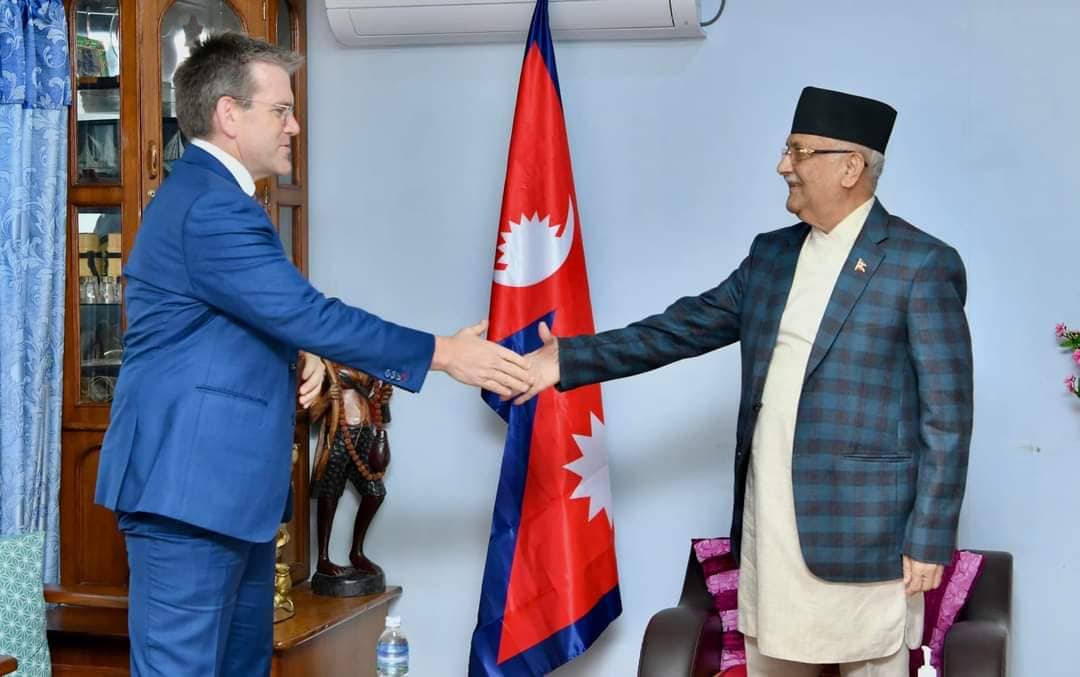 उनीहरू बीच शिष्टाचार भेट भएको एमाले अध्यक्ष ओलीको सचिवालयले जनाएको छ । अमेरिकी राजदूतले यसअघि प्रधानमन्त्री शेरबहादुर देउवा र माओवादी केन्द्रका अध्यक्ष पुष्पकमल दाहालसंग भेटवार्ता गरेका थिए ।