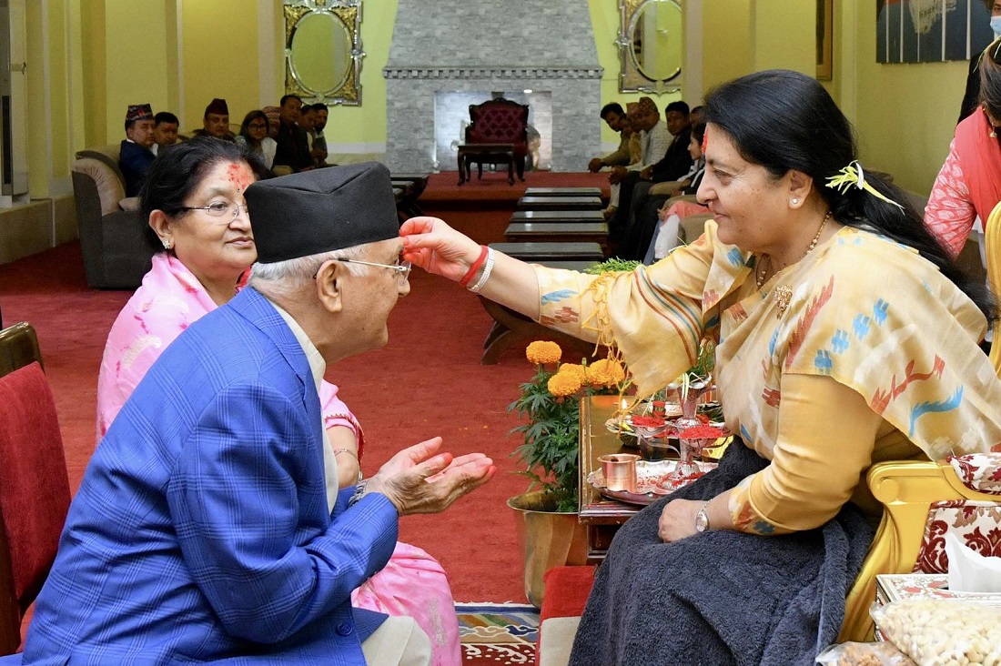 काठमाण्डु – नेकपा एमालेका अध्यक्ष केपी शर्मा ओली दम्पत्तीले राष्ट्रपति विद्यादेवी भण्डारीकाे हातबाट टिका लगाएका छन् ।