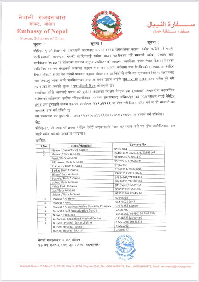 दूतावासले यात्रा गर्ने समयमा कम्तिमा सात दिनभित्रको कोरोना नेगेटिभ रिर्पोट अनिवार्य रुपमा पेश गर्न भनेको छ । ओमानबाट असार १ गते सलाम एयरमार्फत १८० नेपालीहरु स्वदेश फर्कँदैछन् ।