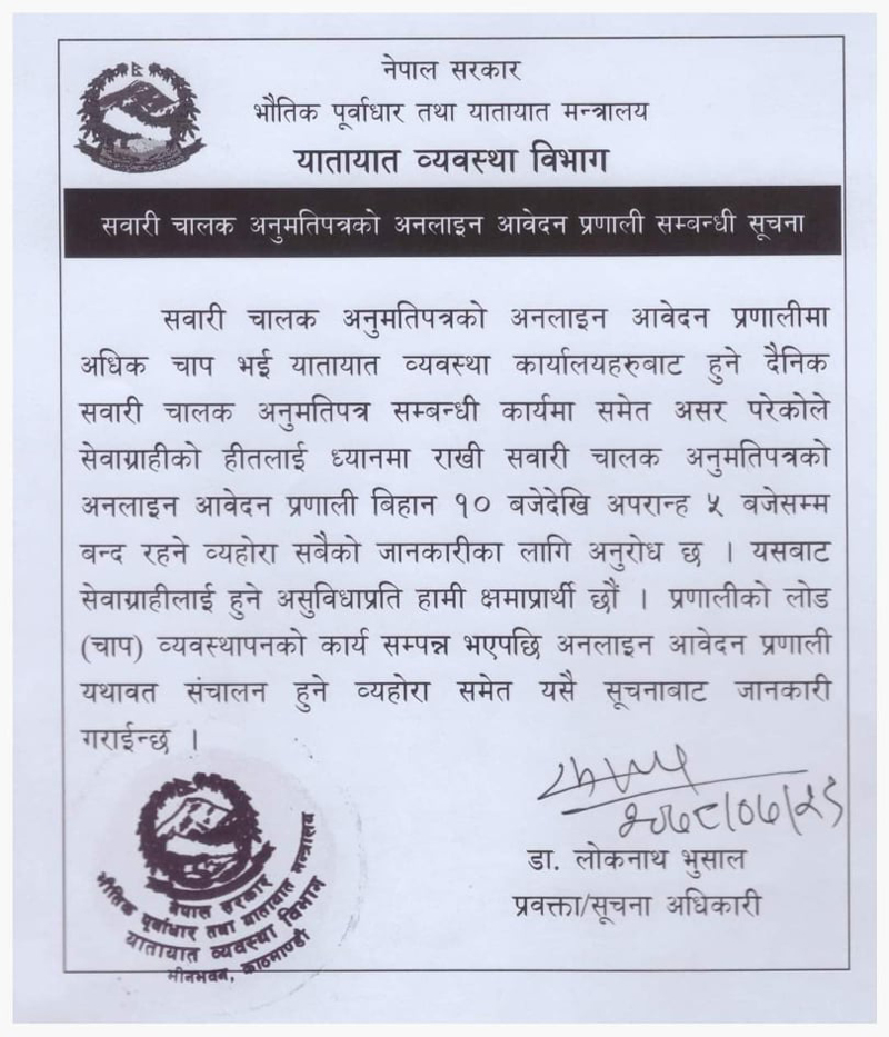 ‘सवारी चालक अनुमतिपत्रको अनलाइन आवेदन प्रणालीमा अधिक चाप भइ यातायात व्यवस्था कार्यालयहरुबाट हुने दैनिक सवारी चालक अनुमतिपत्रसम्बन्धी कार्यमासमेत असर परेकोले सेवाग्राहीको हितलाई ध्यानमा राखी सवारी चालक अनुमतिपत्रको अनलाइन आवेदन प्रणाली बिहान १० बजेदेखि अपराह्न ५ बजेसम्म बन्द रहने व्यहोरा सबैको जानकारीका लागि अनुरोध छ,’ विभागले जारी गरेको सूचनामा उल्लेख छ ।