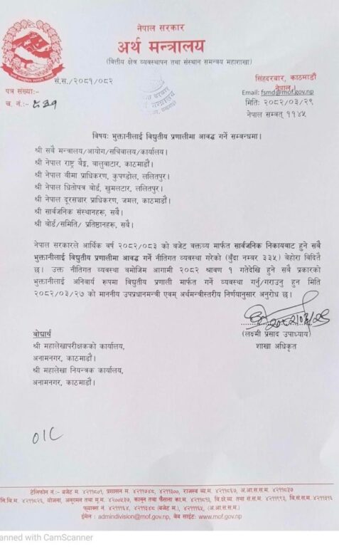 अब सार्वजनिक निकायबाट हुने सबै प्रकारको भुक्तानी अनिवार्य विद्युतीय प्रणालीबाट गर्नुपर्ने भएको छ । परिपत्रसँगै सरकारी र सार्वजनिक निकायबाट हुने नगद तथा चेकमार्फत हुने भुक्तानी रोकिनेछ ।