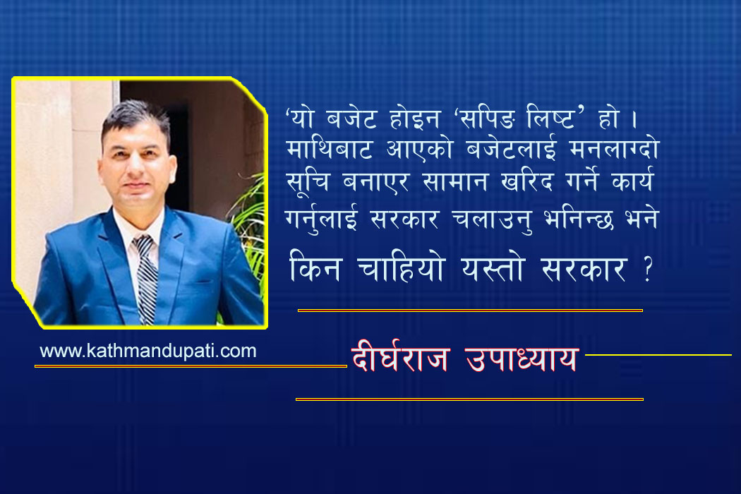 पहिलो कुरा त यो बजेट नै होइन । यो ‘सपिङ लिष्ट’ हो । आम्दानीको कुनै आधार छैन । खर्चका कुनै नियमहरू छैनन् । माथिबाट आएको बजेटलाई मनलाग्दो सूचि बनाएर सामान खरिद गर्ने कार्य गर्नुलाई सरकार चलाउनु भनिन्छ भने किन चाहियो यस्तो सरकार ? हो, यसैलाई भन्छन्, फुपूको धन मामाको श्राद्ध।