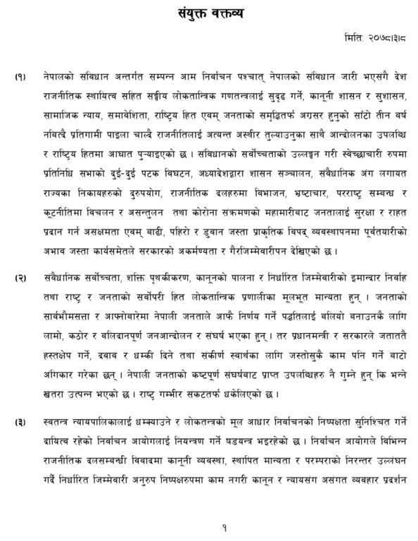 विपक्षी गठबन्धनमा रहेका दलहरु नेपाली कांग्रेस, नेकपा माओवादी केन्द्र, नेकपा एमालेको माधवकुमार नेपाल पक्ष, जनता समाजवादी पार्टी र राष्ट्रिय जनमोर्चाले मंगलबार संयुक्त विज्ञप्ति जारी गरी प्रधानमन्त्री केपी शर्मा ओलीको अलोकतान्त्रिक कदमले राष्ट्र गम्भीर संकटतर्फ धकेलिएको बताएका हुन् ।