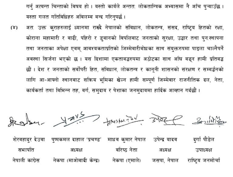 काठमाण्डु – पाँच विपक्षी राजनीतिक दलहरुले राष्ट्र गम्भीर संकटतर्फ धकेलिएको निष्कर्ष निकालेका छन् ।