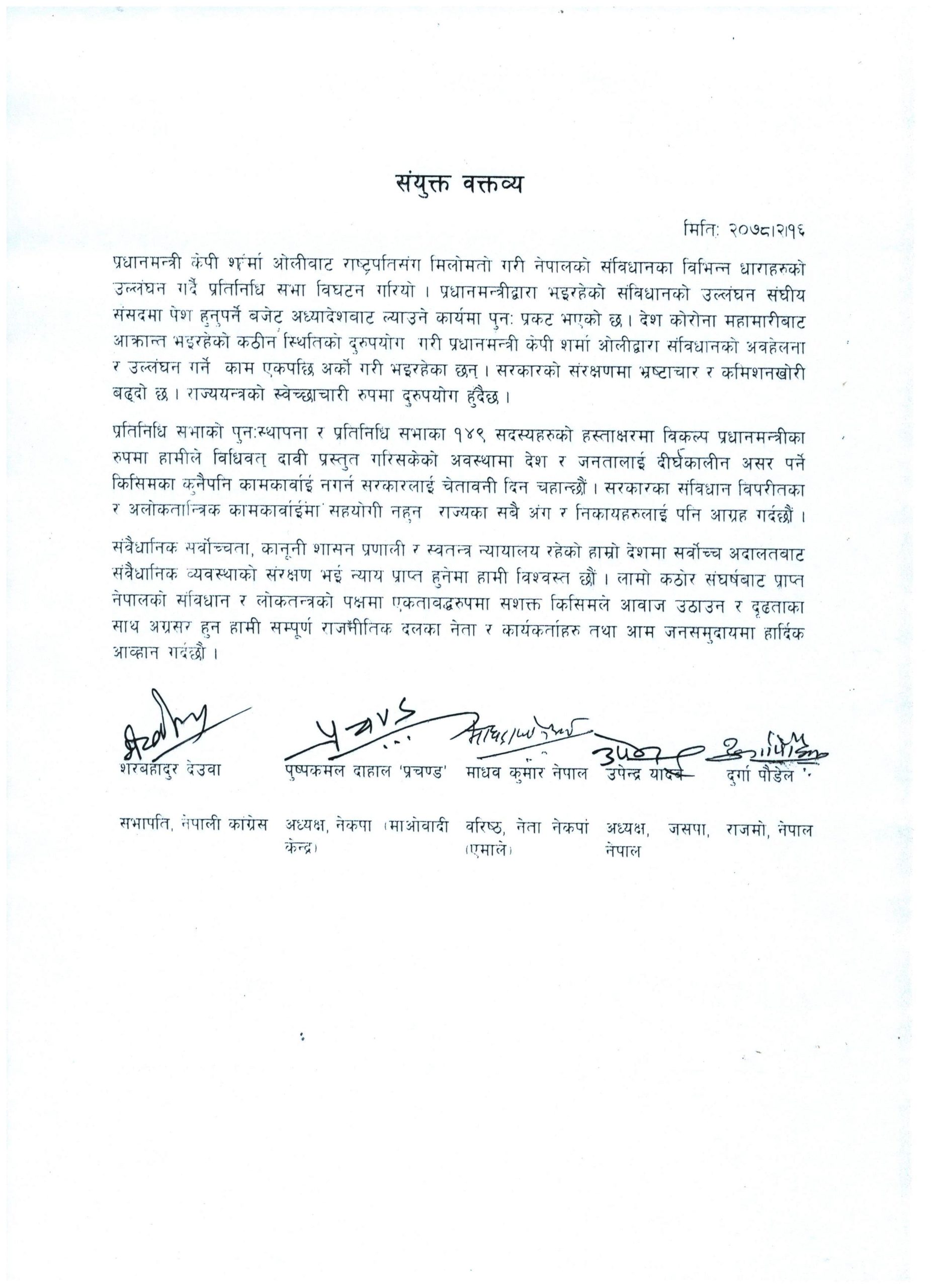 आइतबार नेपाली कांग्रेसका सभापति शेरबहादुर देउवा, माओवादी केन्द्रका अध्यक्ष पुष्पकमल दाहाल प्रचण्ड, जनता समाजवादी पार्टीका अध्यक्ष उपेन्द्र यादव, माधव नेपाल र राजमो नेपालकी दुर्गा पौडेलले संयुक्त विज्ञप्ति जारी गर्दै केपी शर्मा ओली नेतृत्वको सरकारले गरेका अलोकतान्तिक काममा सहयोगी नबन्न आग्रह गरिएको हो ।