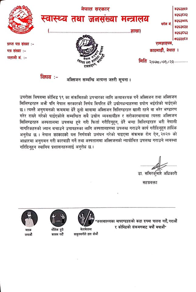 मन्त्रालयका सहप्रवक्ता डा समिरकुमार अधिकारीले बिहीबार एक विज्ञप्ति जारी गर्दै सरकारको निर्णय विपरित उद्योगधन्दाहरुमा अक्सिजन तथा सिलिण्डरहरु प्रयोग भइरहेको भन्दै तत्काल अस्पतालमा उपलब्ध हुने गरी फिर्ता गर्न निर्देशन दिएका हुन् ।