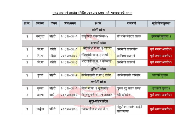 यसैगरी धनकुटास्थित रवि राके भेडेटार सडक, गुल्मीस्थित कालीगण्डकी करिडोर र जुम्लास्थिति जुम्ला–मुगु सडकखण्ड एकतर्फी सञ्चालनमा आएको प्रहरीले जनाएको छ ।