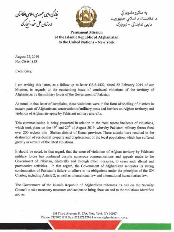 अफगानिस्तान सरकारले पत्रमा पाकिस्तानी सेनाले अफगान भूमिमा सैनिक पोष्ट र छेकबार बनाएको, अगष्ट १९ र २० का दिन कुनार प्रान्तको शेल्तान जिल्लामा २ सय भन्दा धेरै रकेट प्रहार गरेको, आवाशीय सम्पत्ति तथा स्थानीय मानिसहरुलाई विस्थापित गर्नेगरी हवाई क्षेत्रको उल्लङ्घन गरेको आरोप लगाएको छ ।