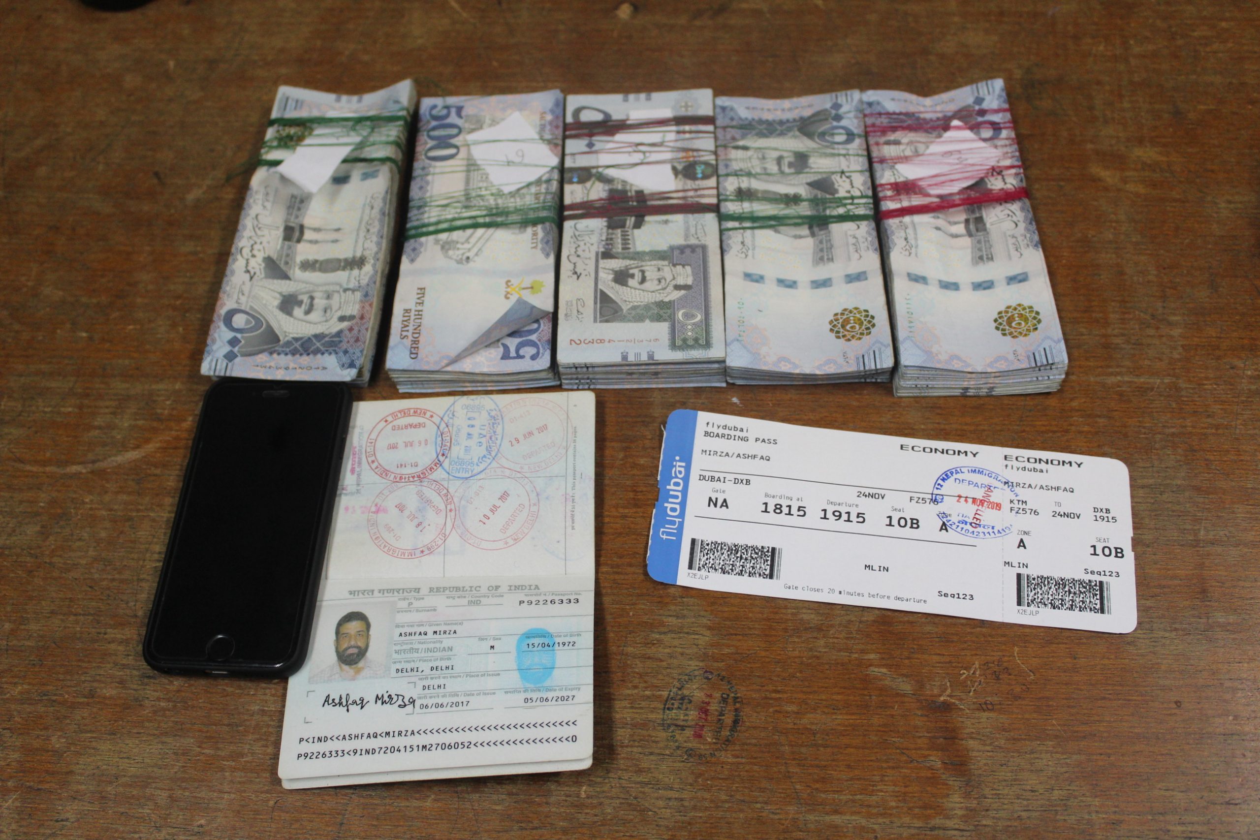 पक्राउ पर्नेमा फ्लाई दुबईको उडानद्वारा दुबई जान लागेका राहदानी नम्बर पि ९२२६३३३ वाहक भारतीय नागरिक ४७ वर्षीय आश्फिक मिर्जा छन् । उडानतर्फको प्रस्थान ह्याण्ड ब्यागेज चेकिङ एरियामा जाँच गर्ने क्रममा उनको झोलाभित्र फल्स बटम बानाई लुकाई छिपाई राखेको ५ सय दरका ३१८ थान गरी उक्त रकम बराबरको साउदी रियाल प्रहरीले फेला पारेको हो ।
