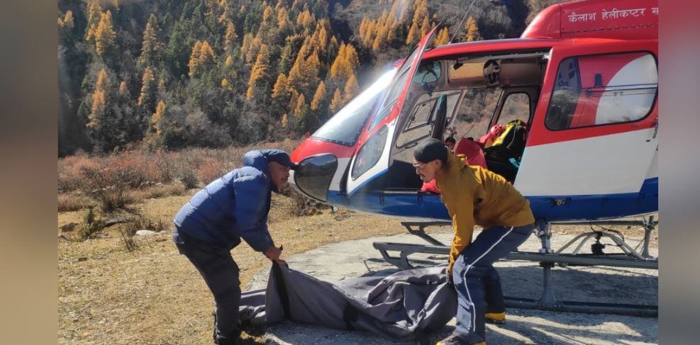 आरोहीको शव हेलिकोप्टरमार्फत सामागाउँ ल्याइएको छ। पाङबारी हिमालबाट फर्कने क्रममा तीन इटालियन नागरिक र एक नेपाली सहयोगी गत बुधबारदेखि पहिलो शिविर र आधार शिविरमा अलपत्र परेका थिए। फरिनातो र गापुटो हिमाल आरोहण गर्न नसकेपछि फर्कने क्रममा हिमपातका कारण अलपत्र परेका बताइएको छ।