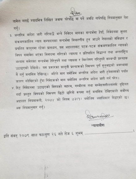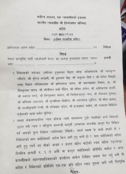 न्यायाधीश ईश्वर खतिवडाको एकल इजलासले मुद्दालाई अग्राधिकार प्रदान गर्दै १५ दिनभित्र लिखित जवाफ पेश गर्न प्रचण्डको नाममा आदेश जारी गरेको छ । सर्वोच्चले आन्तरिम आदेश जारी गर्नुपर्ने आवश्यकता नदेखिएको जनाएको छ ।