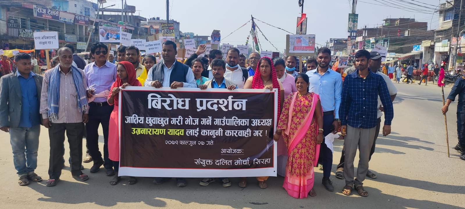 जनकपुरधाम – दलित समुदायमाथि अपमानजनक व्यवहार गर्ने भगवानपुर गाउँपालिका अध्यक्ष उग्रनारायण यादवलाई कारबाहीको माग गर्दै सिरहाको गोलबजारमा प्रदर्शन गरिएको छ । दलित समुदाय माथि विभेद गरिनु कानुनी अपराध भएको भन्दै संयुक्त दलित मोर्चा सिरहाले गाउँपालिका अध्यक्ष यादवलाई कारबाहीको माग गरेका हुन् ।