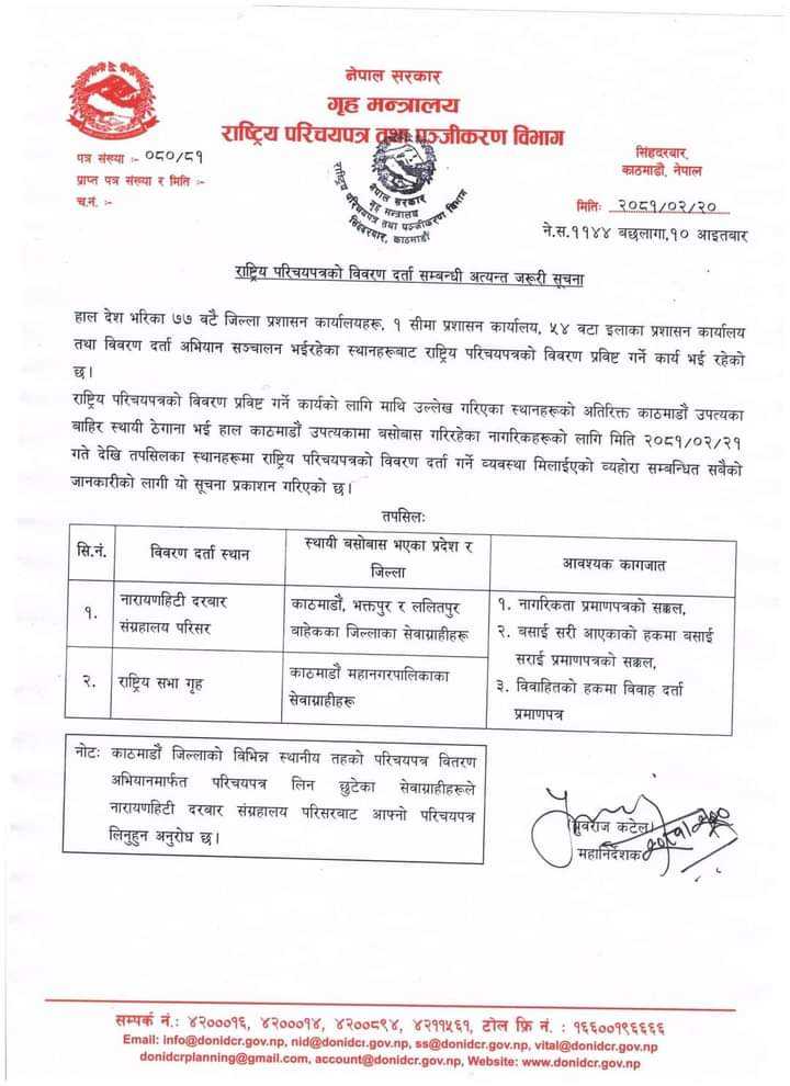 आइतबार एक सूचना जारी गर्दै राष्ट्रिय परिचयपत्र तथा पञ्जीकरण विभागले उपत्यका बाहिर स्थायी ठेगाना भई हाल राजधानीमा बसोबास गरिरहेका नागरिकहरूका लागि सोमबारबाट नारायणहिटी दरबार संग्रहालय परिसरमा राष्ट्रिय परिचयपत्रको विवरण दर्ता गर्नसक्ने जनाएको छ ।