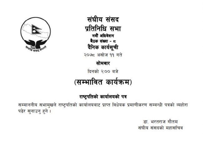बैठकमा राष्ट्रपति कार्यालयबाट प्राप्त विधेयक प्रमाणीकरण सम्बन्धी पत्रको व्यहोरा सभामुखले पढेर सुनाउने कार्यसूची रहेको संसद सचिवालयले जनाएको छ ।