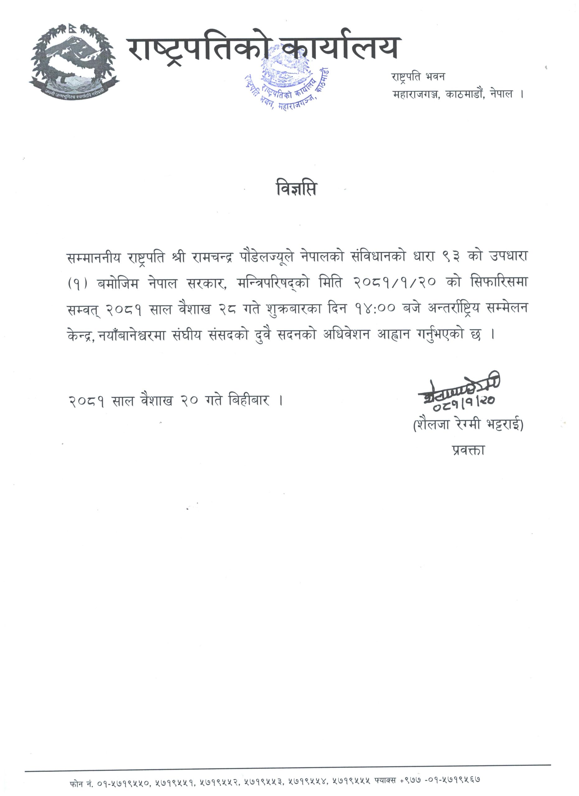 राष्ट्रपति कार्यालयकी प्रवक्ता शैलजा रेग्मी भट्टराईद्वारा जारी विज्ञप्तिमा भनिएको छ, ‘सम्माननीय राष्ट्रपति श्री रामचन्द्र पौडेलज्यूले नेपालको संविधानको धारा ९३ को उपधारा (१) बमोजिम नेपाल सरकार, मन्त्रिपरिषद्को मिति २०८१/१/२० को सिफारिसमा सम्वत् २०८१ साल वैशाख २८ गते शुक्रबारका दिन १४ः०० बजे अन्तर्राष्ट्रिय सम्मेलन केन्द्र, नयाँबानेश्वरमा संघीय संसदको दुवै सदनको अधिवेशन आह्वान गर्नुभएको छ ।’