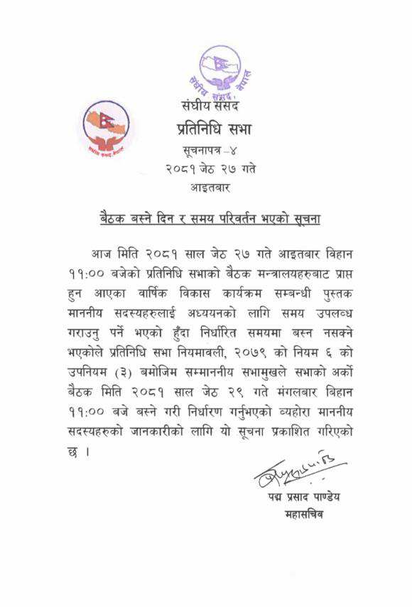 प्रतिनिधि सभा बैठक २९ गते बिहान ११ बजेसम्मका लागि सूचना टाँसेर स्थगित