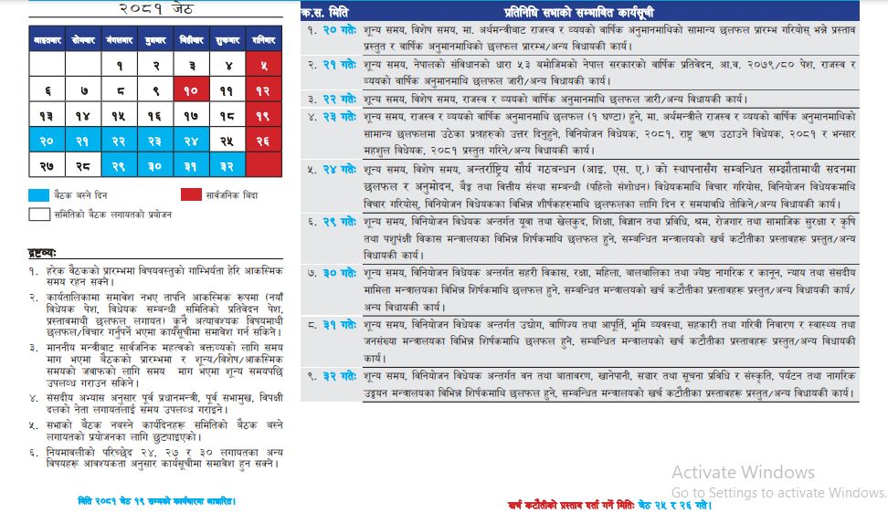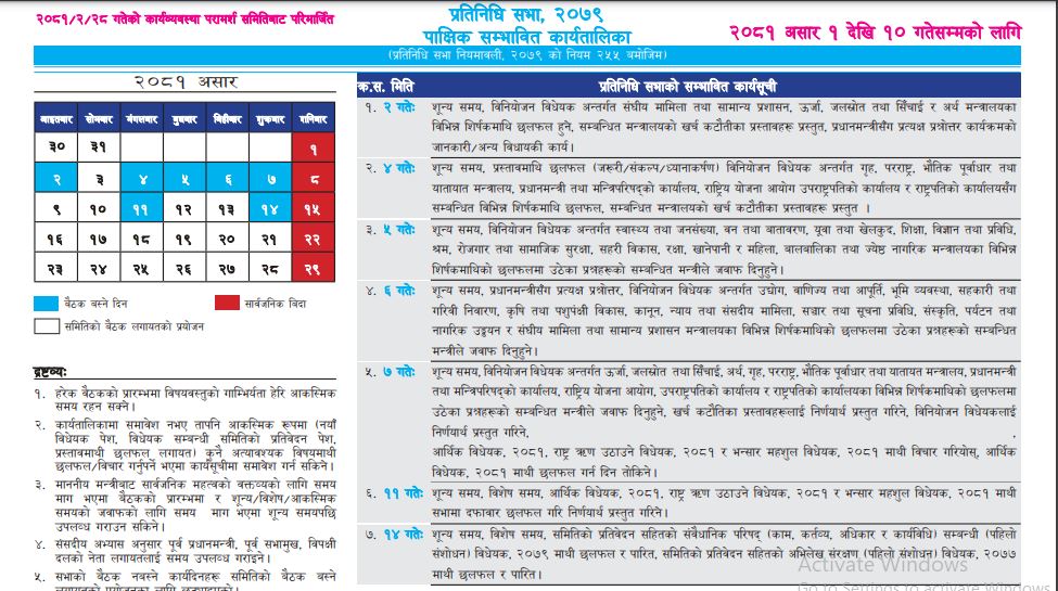 क्यालेण्डरमा अब जेठमा ४ दिन र असारमा ७ दिन प्रतिनिधि सभा बैठक बस्ने उल्लेख छ ।
