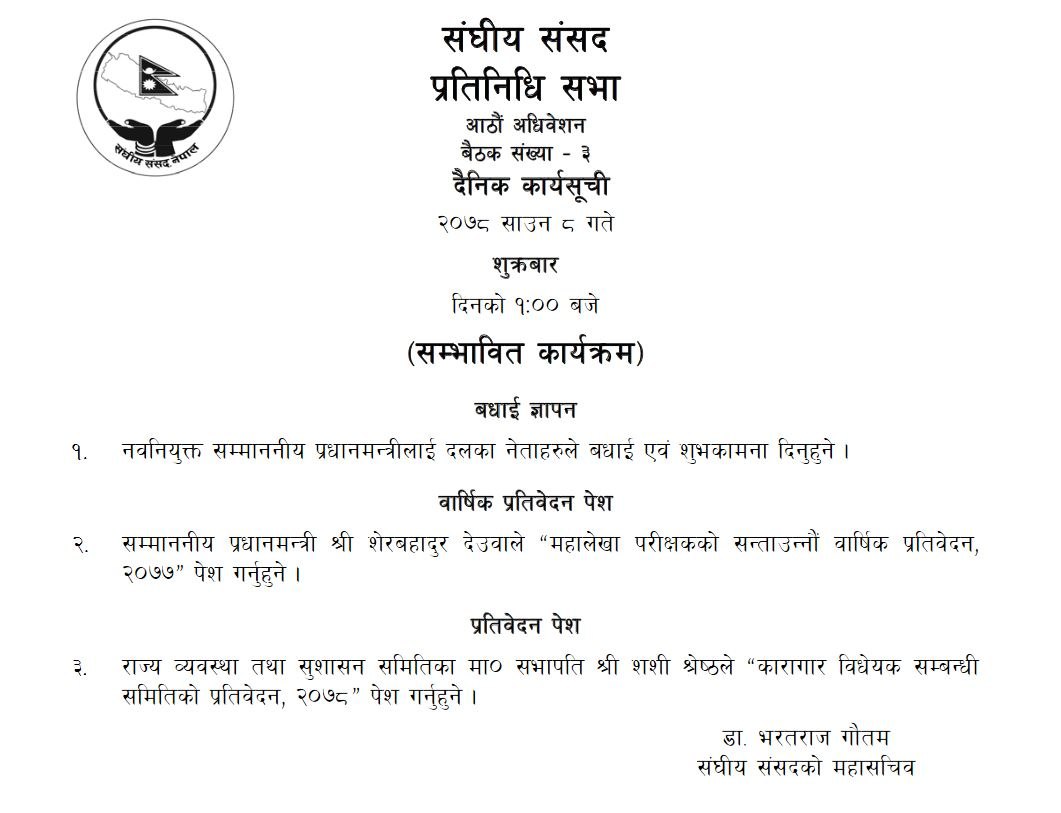 संसद सचिवालयका अनुसार प्रधानमन्त्री देउवाले महालेखा परीक्षकको ५७ औं वार्षिक प्रतिवेदन पेश गर्ने र राज्य व्यवस्था तथा सुशासन समितिको कारागार विधेयक सम्बन्धी समितिको प्रतिवेदन, २०७८ पेश गर्ने कार्यसूची रहेको छ ।