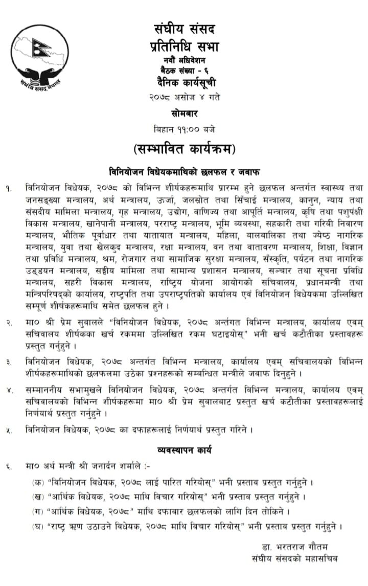 संसद् सचिवालयले बिहान ११ बजे बस्ने बैठकका कार्यसूची सार्वजनिक गरेको हो । कार्यसूचीमा विनियोजन विधेयकमाथिको छलफल तथा जवाफ दिने रहेको छ ।