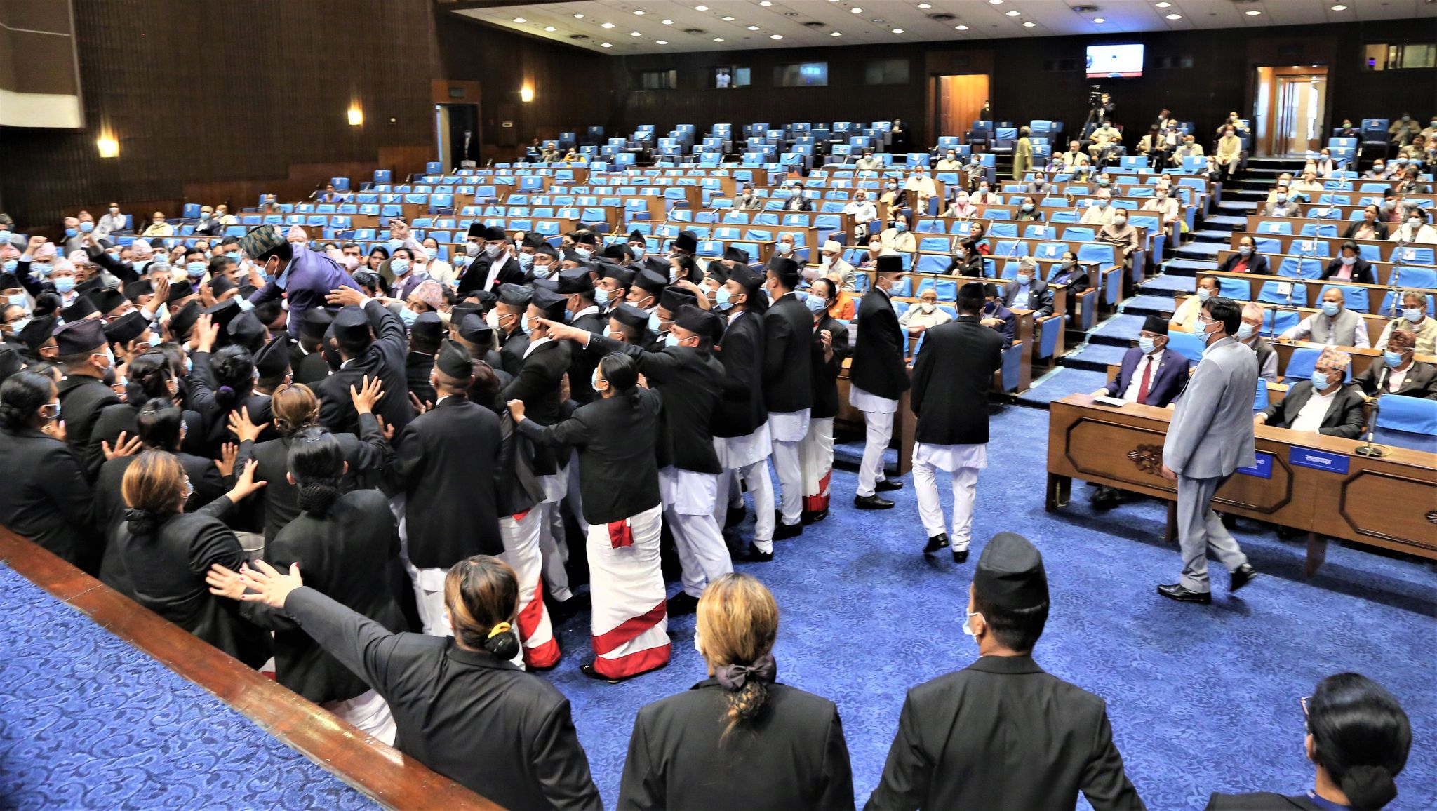 प्रतिपक्षीको नारावाजीका कारण सभामुख सापकोटा हतारिएका जस्तो देखिन्थे । यहीबीचमा सभामुख सापकोटा र नेपाल मजदूर किसान पार्टीका सांसद प्रेम सुवालबीच सवाल जवाफ भएको छ ।