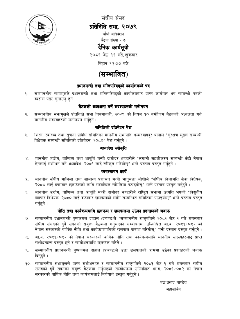 संसद् सचिवायलयले बैठकबाट नीति तथा कार्यक्रम पारित गर्ने सम्भावित कार्यसूची सार्वजनिक गरेको छ । संसद् सचिवालयले बैठकमा नीति तथा कार्यक्रममाथि छलफल गर्ने र पारित गर्ने सम्भावित कार्यसूची सार्वजनिक गरेको हो ।