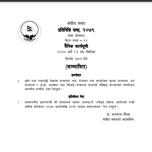 बैठकमा कृषि तथा पशुपन्छी विकास मन्त्रालय, श्रम, रोजगार तथा सामाजिक सुरक्षा मन्त्रालय, अर्थ मन्त्रालय र ऊर्जा, जलस्रोत तथा सिँचाई मन्त्रालय सम्बन्धी प्रश्नको सम्बन्धित मन्त्रीले जवाफ दिने सम्भावित कार्यसूची रहेको छ ।