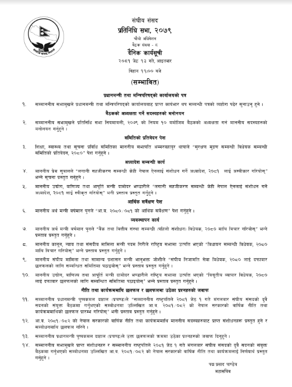त्यस्तै, शिक्षा, स्वास्थ्य तथा सूचना प्रविधि समितिका सभापति अम्मरबहादुर थापाले सुरक्षण मुद्रणसम्बन्धी विधेयकसम्बन्धी समितिको प्रतिवेदन पेस गर्ने सम्भावित कार्यसूचीमा छ ।