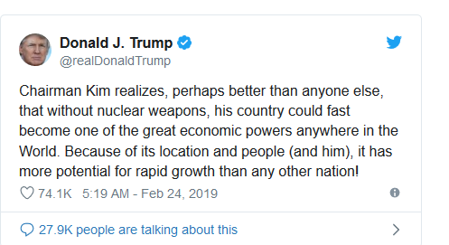 आफ्ना विदेशमन्त्री माइक पोम्पेओले उत्तर कोरिया अझै पनि पारमाणविक खतरा रहेको बताएको केही घण्टामै ट्रम्पले त्यस्तो टिप्पणी गरेका हुन्। ट्रम्प र उत्तर कोरियाका नेता किम जङ(अनबीच दोस्रो शिखरवार्ता यही बुधवार र बिहीवार भियतनामको राजधानी हनोईमा हुँदैछ।