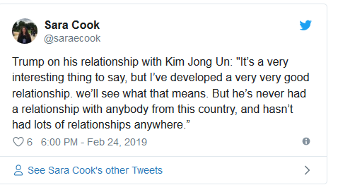 ट्रम्पको यो भनाइ दोस्रो वार्तामा भियतनाम जानुअघि आएको हो। उत्तर कोरियाली नेता किम प्योङ्याङबाट रेल चढेर हनोईतिर हिँडिसकेका छन्। अमेरिकी विदेशमन्त्री पोम्पेओले दुई नेताहरूको शिखरवार्ताबाट ठूलो प्रतिफल नआउने आशय व्यक्त गरेका छन्। आइतवार फक्स न्यूजसँग कुरा गर्दै उनले भने, ूहामीले सबै कुरा यो हप्ता हासिल नगर्न सर्क्छौँ, तरे हामी महत्त्वपूर्ण कदम चाल्ने अपेक्षामा छौँ।
