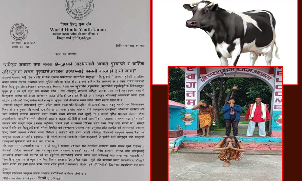 ‘धरानमा केही दिन अगाडि धार्मिक द्वन्द्व निम्त्याउने आपराधिक समूहद्वारा हिन्दुत्वको नै अपमान हुनेगरी सामाजिक संजालमार्फत साक्षात लक्ष्मीको रुपमा पुजिने गाई (गोरु) काटेर भोज खाएको घटना अक्ष्यम्य छ । उक्त घृणित घटनाको विश्व हिन्दू युवा संघ डडेल्धुरा घोर भर्त्सना गर्दछ । नेपालको कानुनले गौ हत्यालाई पूर्णतः वर्जित गरेको भएता पनि दिनानुदिन गौहत्याको घटना बढनु गम्भीर तथा चिन्ताजनक विषय हो । कानुनमा गौ हत्यालाई दण्डनीय अपराध भनेर उल्लेख गरिएको छ ।’ उक्त विज्ञप्तिमा भनिएको छ ।