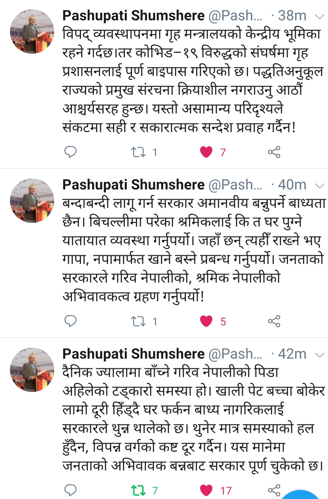 राप्रपा अध्यक्षले ट्वीट गर्दै प्रकोपको बेलामा सरकार मितव्ययी बन्नु पर्ने सुझाएका छन् । पछिल्ला नियुक्तिहरू असान्दर्भिक रहेको भन्दै सरकारको आलोचना समेत गरेका छन् । ‘विश्व महामारीमा छ, देश संकटमा छ । तर कहीँ नभएको जात्रा हाँडी गाउँमा जस्तो सरकार नयाँ–नयाँ पद सिर्जनामा लागेको छ । जबकी सरकार अहिले मितव्ययी बनेर उदाहरण बन्नु पर्ने हो,’ उनले भने । ‘यसैले अत्यावश्यक बाहेकका सुविधा, जम्बो सुरक्षा, सल्लाहकार टोली कटौती गरी स्रोत जनसेवामा लगाउनु बुद्धिमानी हुनेछ ।’