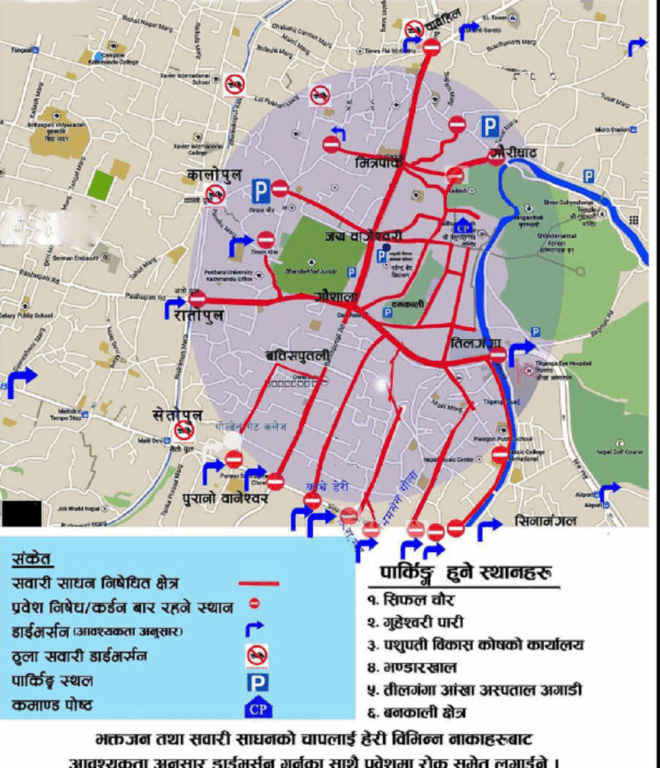 उनका अनुसार सदाझैँ चाबहिल, गौशाला, तिलगंगा क्षेत्रमा निर्वाधरुपमा सवारी साधन चलाउने व्यवस्था मिलाइएको छ। तर भक्तजनको भिडभाड अत्याधिक भई सवारी आवागमनमा समस्या हुने अवस्था भएको खण्डमा मात्र डाइभर्सनको नीति अबलम्बन गरि वैकल्पिक मार्गबाट सवारी साधन सञ्चालनको व्यवस्था मिलाइने छ।