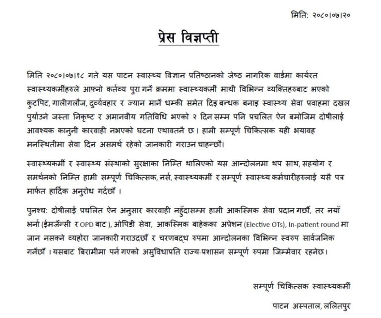 गत शनिबार पाटन अस्पतालमा उपचाररत दुई बिरामीको सुईको माध्यमबाट औषधि दिएको केहीबेरमै मृत्यु भएको थियो। त्यसपछि आक्रोशित आफन्तले चिकित्सक र स्वास्थ्यकर्मीमाथि हातपात गरेका थिए।