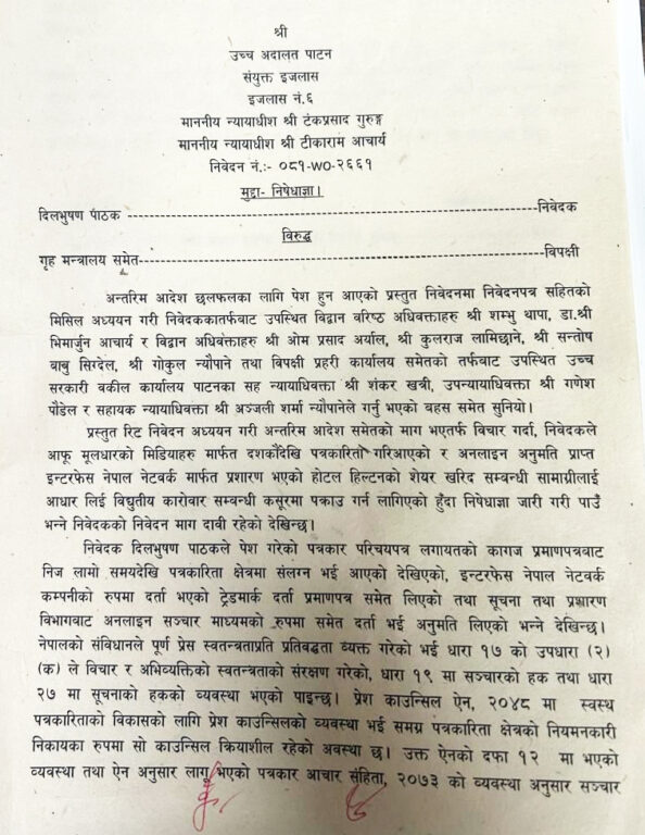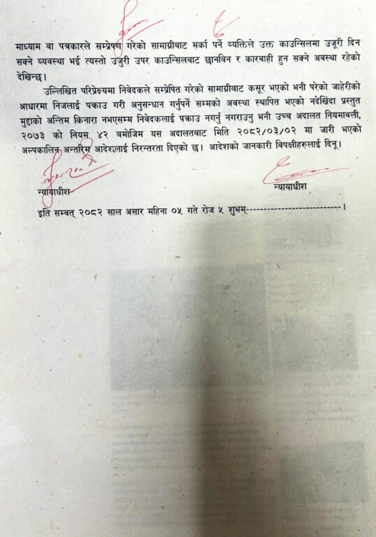 आदेशमा भनिएको छ, ‘निवेदकले सम्प्रेषण गरेको सामग्रीबाट कसूर भएको भनी परेको जाहेरीको आधारमा निजलाई पक्राउ गरी अनुसन्धान गर्नुपर्नेसम्मको अवस्था स्थापित भएको नदेखिँदा प्रस्तुत मुद्दाको अन्तिम किनारा नभएसम्म निवेदकलाई पक्राउ नगर्नु/नगराउनु ।’