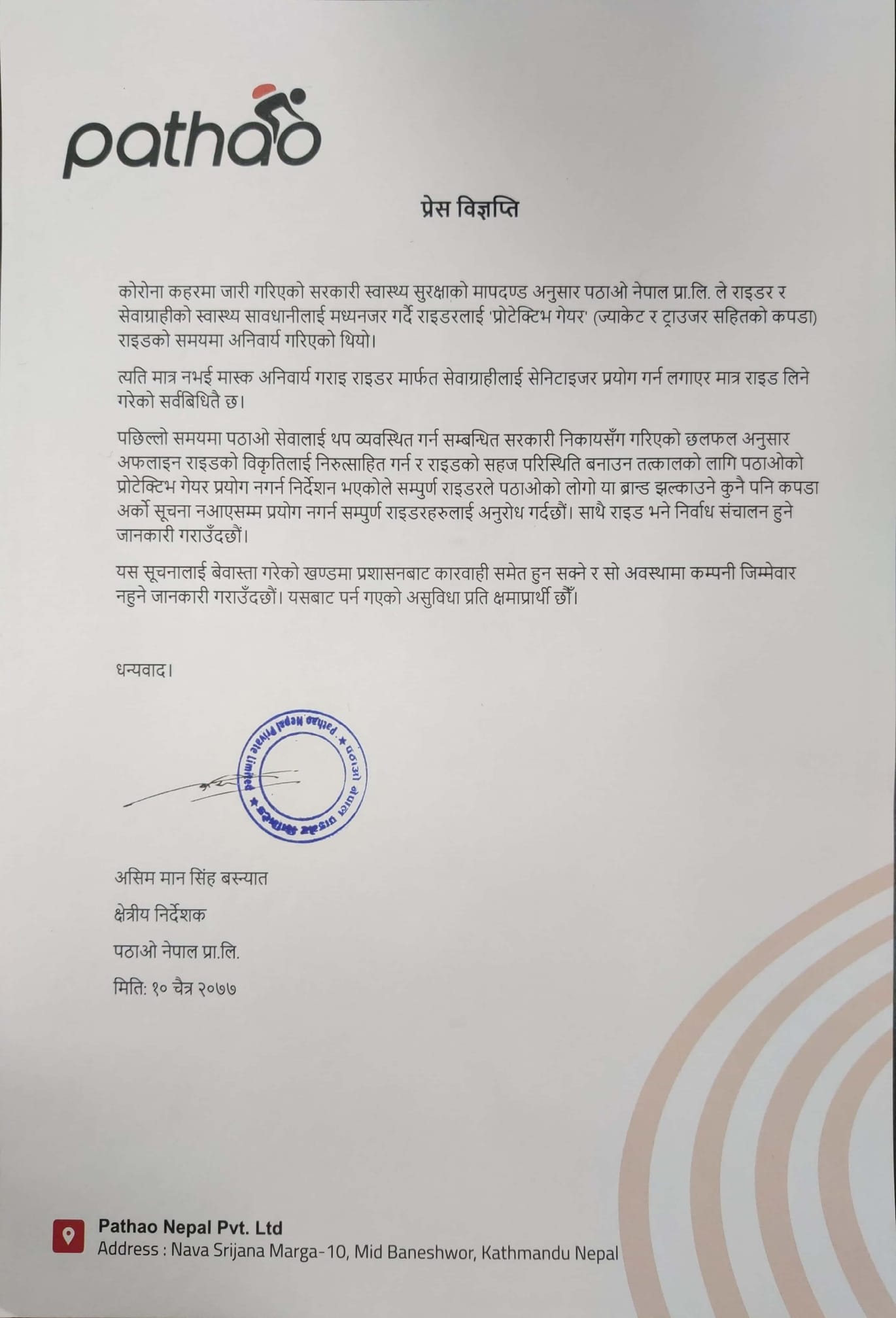 मंगलबार कम्पनीका क्षेत्रीय निर्देशक असिम मान सिंह बस्न्यातले अफलाइन राइडको विकृतिलाई रौक्न र राइडको सहज परिस्थिति बनाउन तत्कालका लागि पठाओको प्रोटेक्टिभ गेयर प्रयोग नगर्न निर्देशन भएकाले पठाओको लोगोसहितको कपडा प्रयोग नगर्न आग्रह गरेका छन् । उनले पठाओको सेवा बन्द नभएको पनि जानकारी गराएका छन् ।