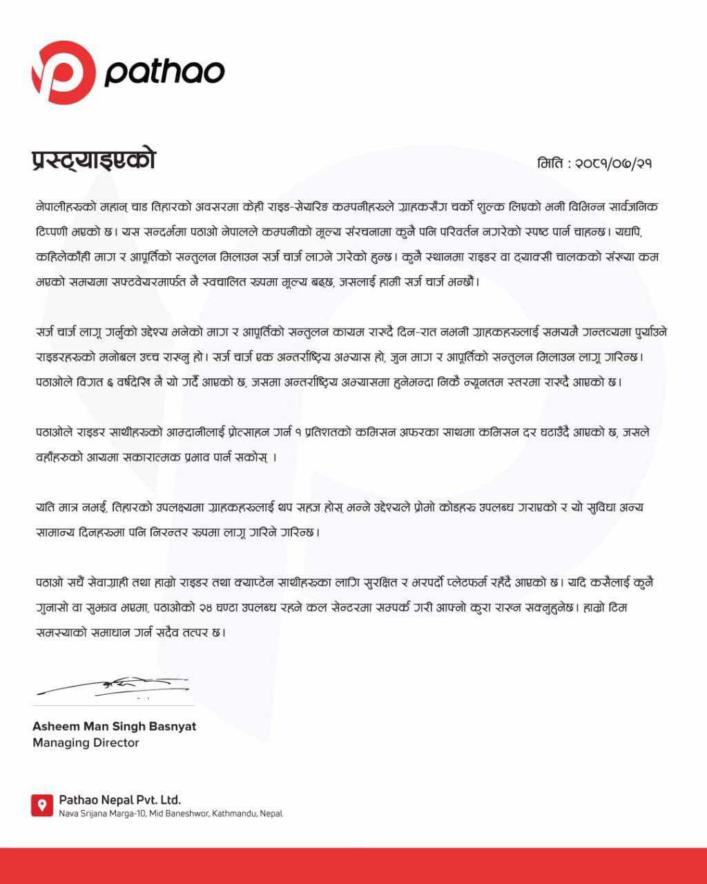 विज्ञप्तिमा भनिएको छ, ‘कुनै स्थानमा राइडर वा ट्याक्सी चालकको संख्या कम भएको समयमा सफ्टवेयरमार्फत नै स्वचालित रूपमा मूल्य बढ्छ, जसलाई हामी ‘सर्ज चार्ज’ भन्छौँ । ‘सर्ज चार्ज’ लागू गर्नुको उद्देश्य भनेको माग र आपूर्तिको सन्तुलन कायम राख्दै दिन–रात नभनी ग्राहकहरूलाई समयमै गन्तव्यमा पुर्याउने राइडरहरूको मनोबल उच्च राख्नु हो । सर्ज चार्ज एक अन्तर्राष्ट्रिय अभ्यास हो, जुन माग र आपूर्तिको सन्तुलन मिलाउन लागू गरिन्छ । पठाओले विगत ६ वर्षदेखि नै यो गर्दै आएको छ, जसमा अन्तर्राष्ट्रिय अभ्यासमा हुनेभन्दा निकै न्यूनतम स्तरमा राख्दै आएको छ ।’