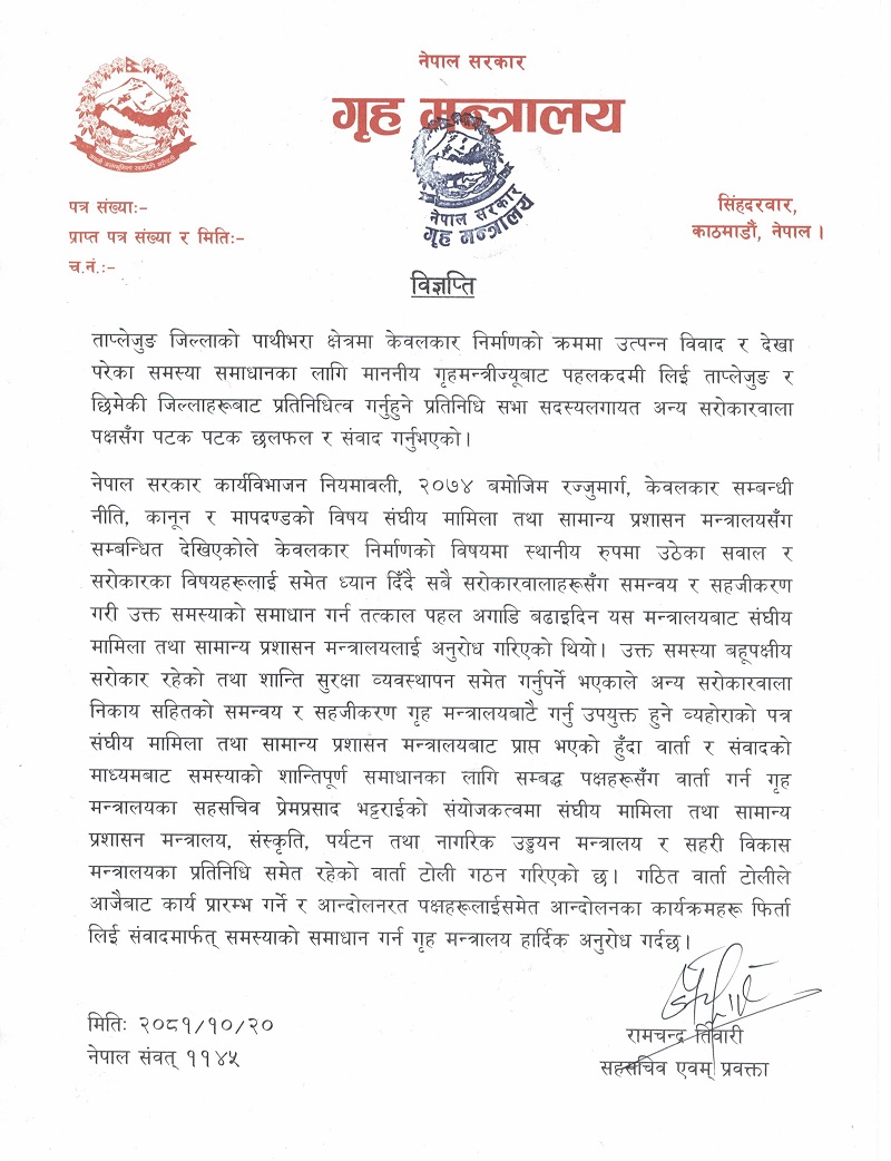 काठमाण्डु-सरकारले ताप्लेजुङको पाथीभरा मुक्कुम्लुङ क्षेत्रमा केवलकार निर्माणको क्रममा उत्पन्न विवाद समाधानका लागि सम्बद्ध पक्षहरूसँग वार्ता गर्न वार्ता टोली गठन गरेको छ ।